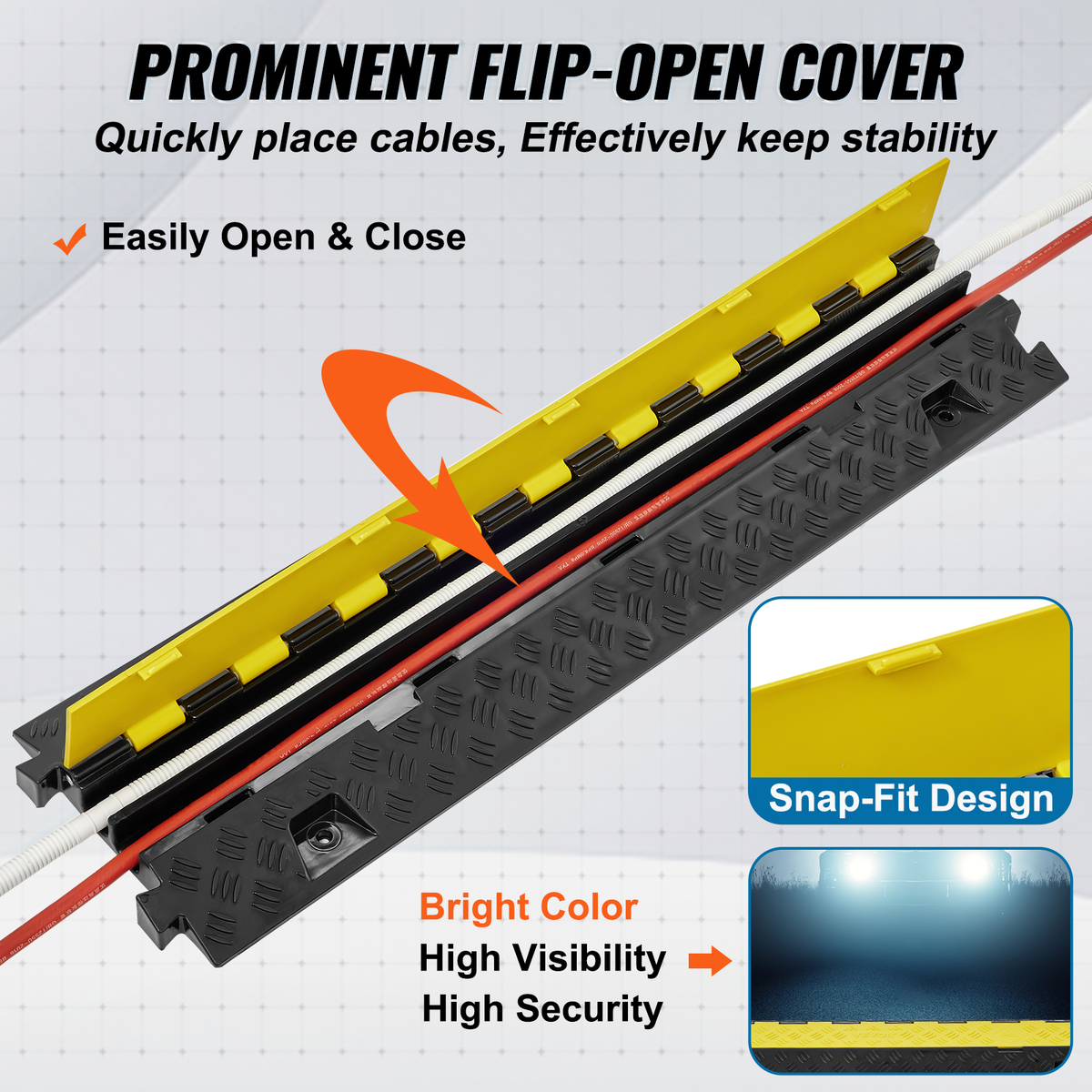 High Convenience Flawless Security: The flip-open top cover design makes the wire cover ramp quick to place and makes removing cables easier than ever. It features eye-catching yellow to enhance the passers-byโs security. Snap-fit design of the top cover avoids accidental opening, and the anti-slip texture increases stability.