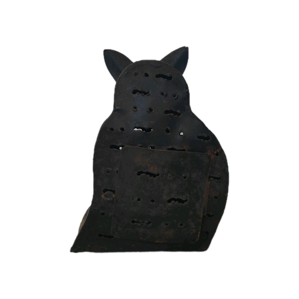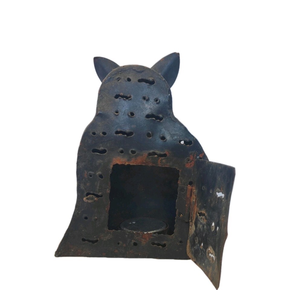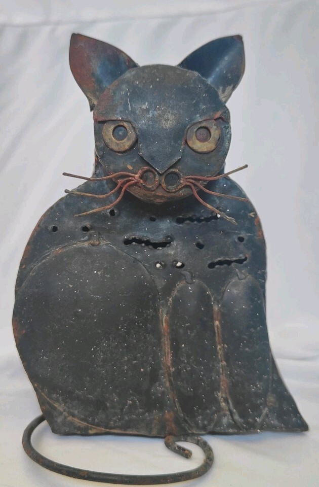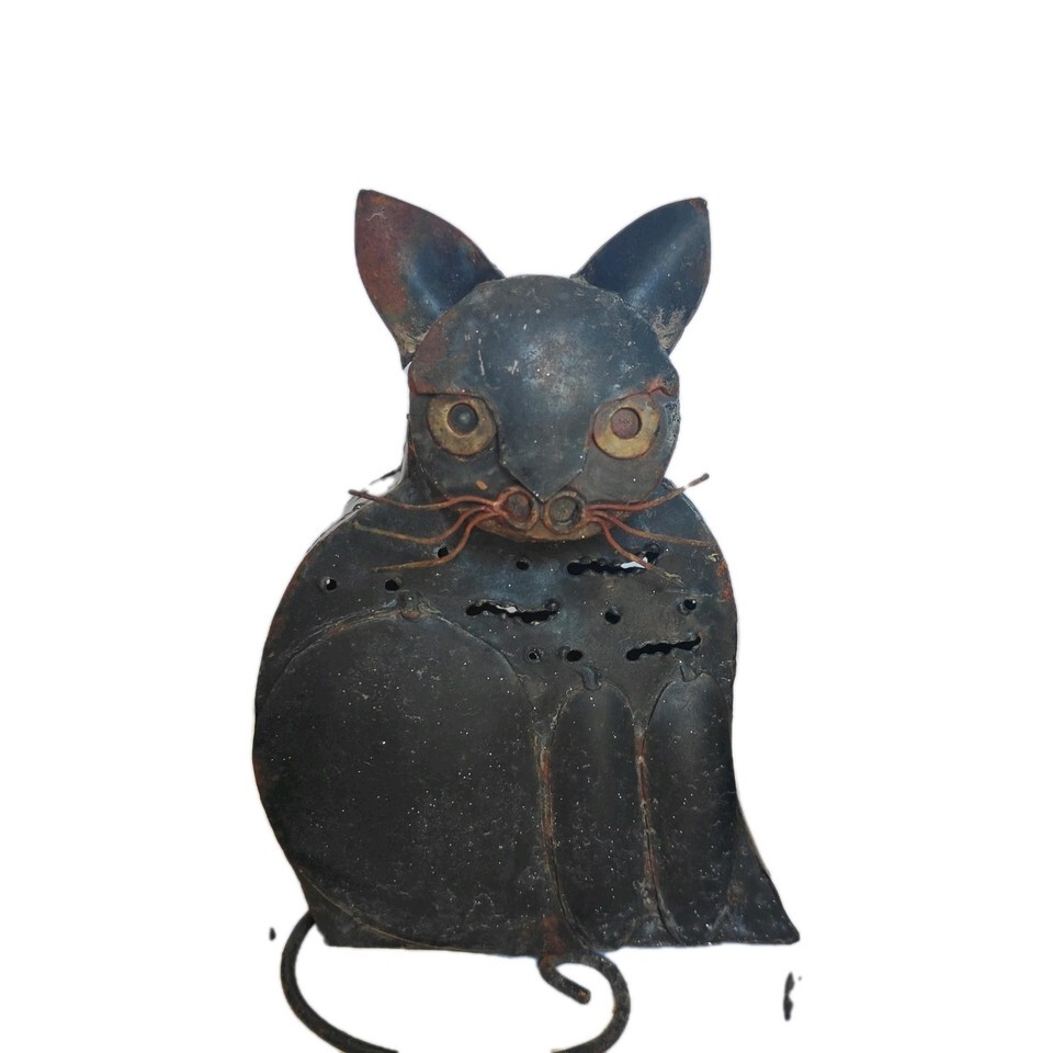 The product is a set of three metal cat tealight candle holders, suitable for indoor and outdoor use. The holders have a weathered folk art primitive style, making them suitable for any room. The abstract design features a swing door for access to the candles, and the medium-sized holders are designed for tealight use. These candle holders are a unique and charming addition to any home decor, especially for those who love animals and have a taste for abstract and quirky items. They are nicely weathered and ready to display. Great for Halloween too!