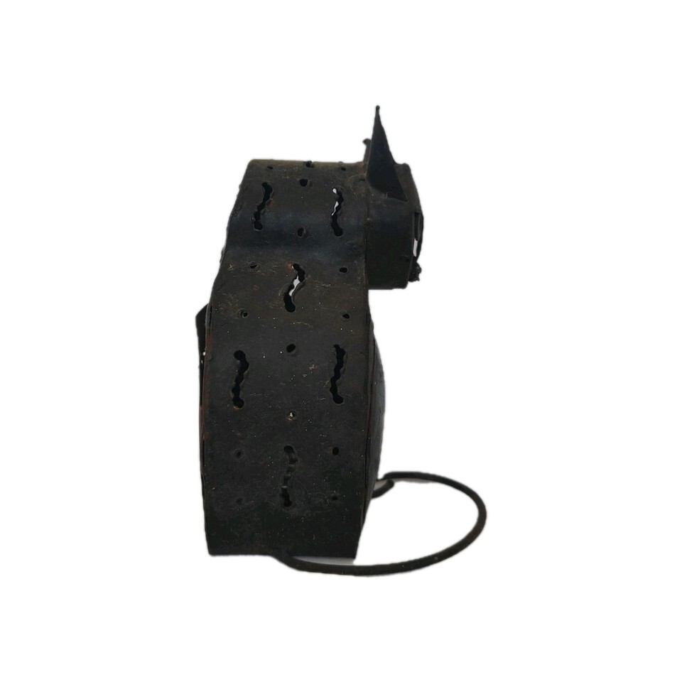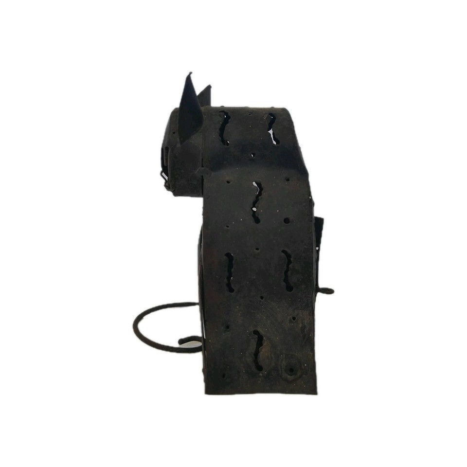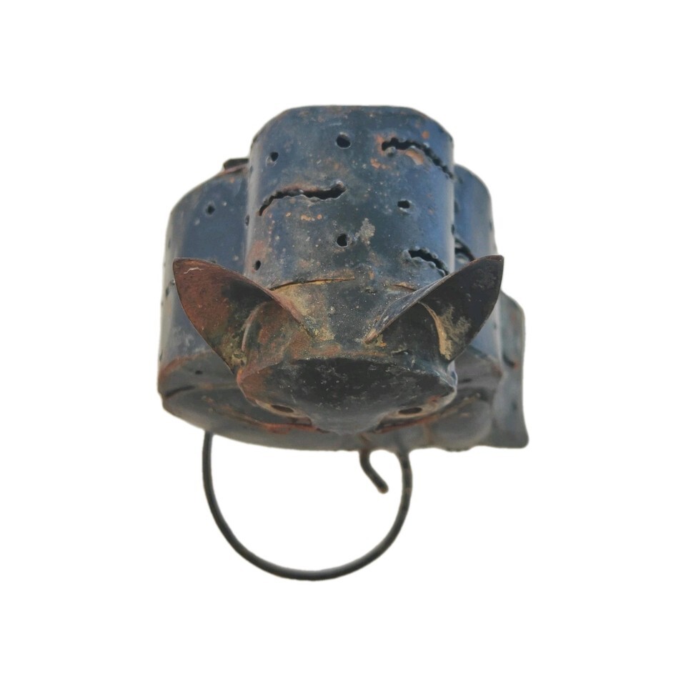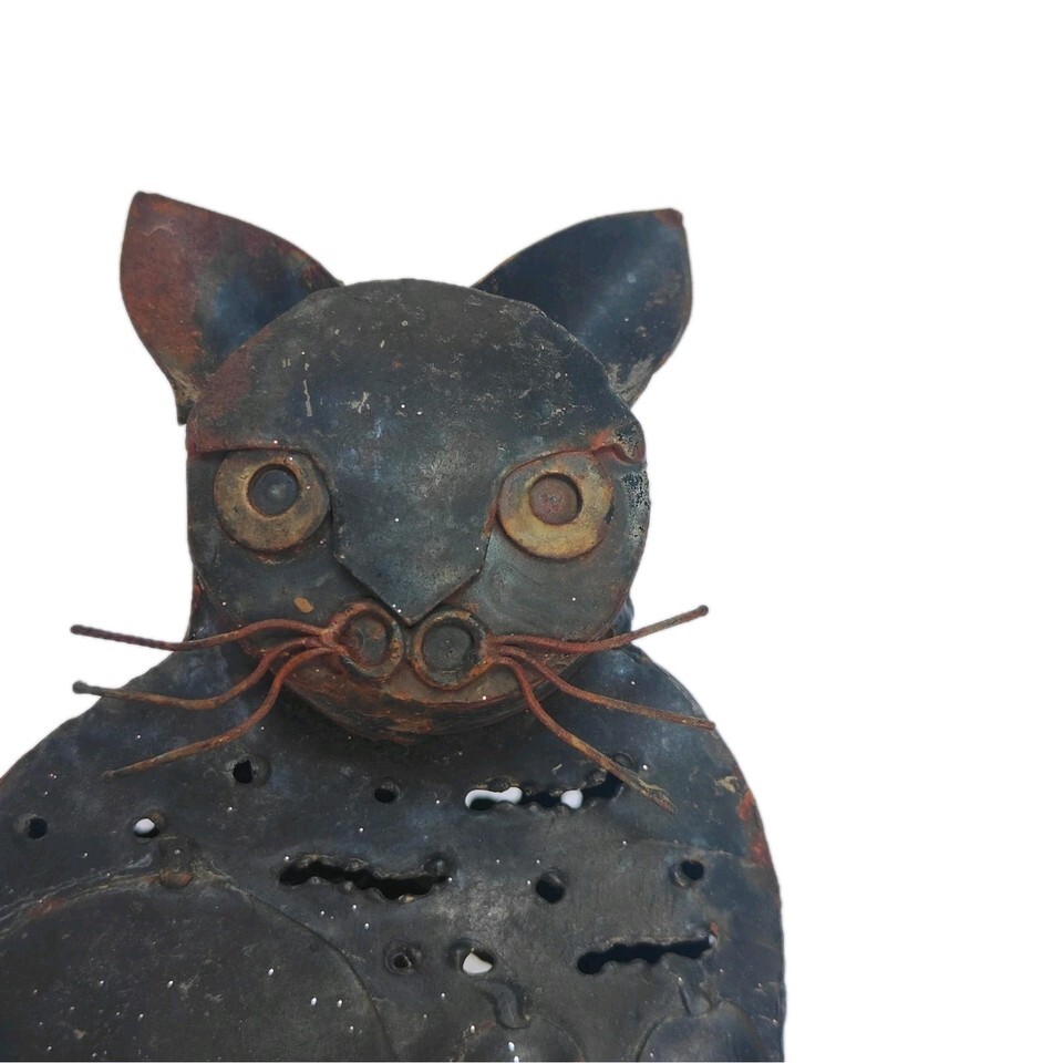 The product is a set of three metal cat tealight candle holders, suitable for indoor and outdoor use. The holders have a weathered folk art primitive style, making them suitable for any room. The abstract design features a swing door for access to the candles, and the medium-sized holders are designed for tealight use. These candle holders are a unique and charming addition to any home decor, especially for those who love animals and have a taste for abstract and quirky items. They are nicely weathered and ready to display. Great for Halloween too!