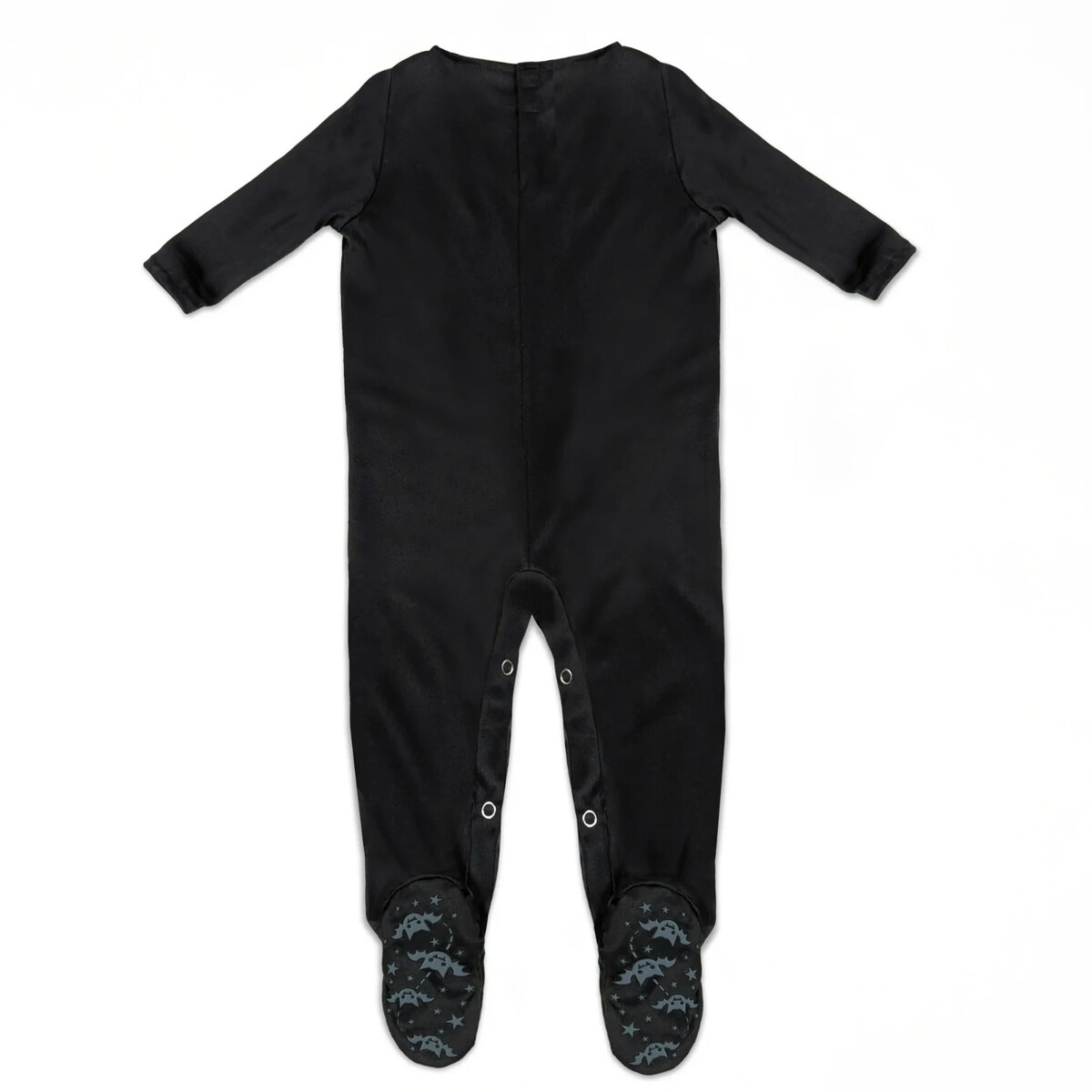 Features: Allover photoreal graphics; footed design; rubber print on soles for added traction; 3D bow tie accent; removable cape with collar