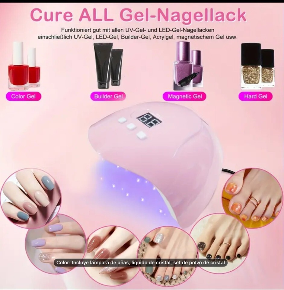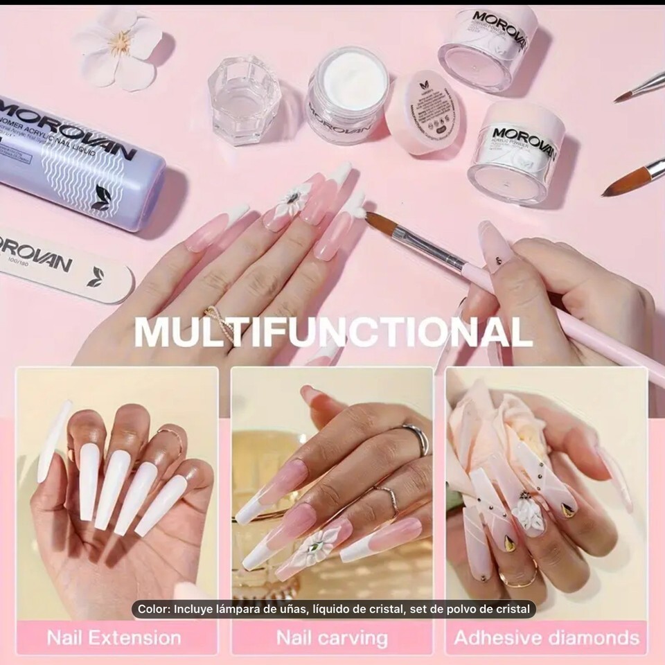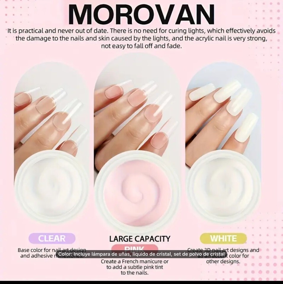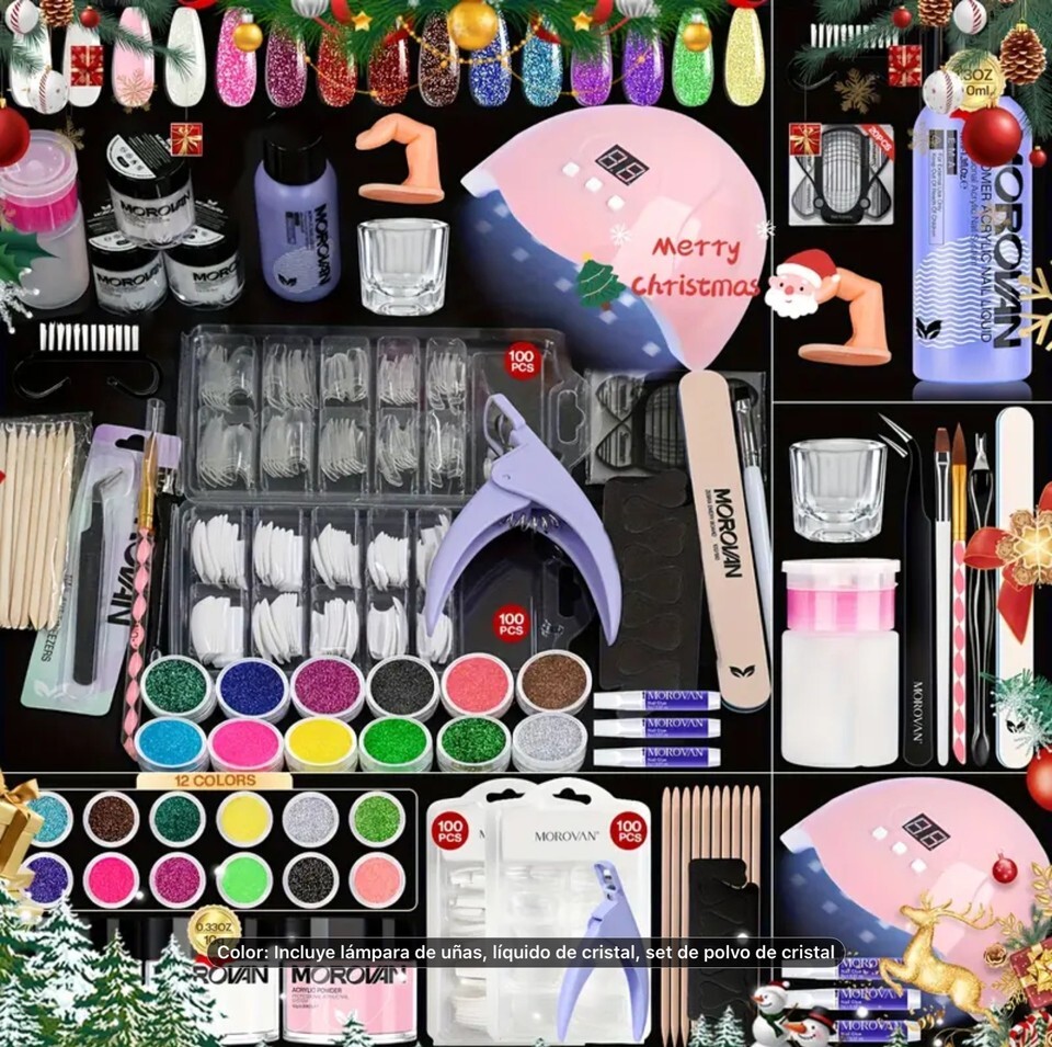 MOROVAN Set de Manicura Economico: Polvo Acrílico Rosa, Transparente y Blanco, Un Botella de 40ml de Esmalte de Uñas, Un Set de Cortaúñas, Una Lampara de Uñas, Una Lampara y 12 Colores de Glitter. Una Solucion Todo en Uno Para Tecnicos de Uñas, Regalos Navideños de Arte de Uñas.