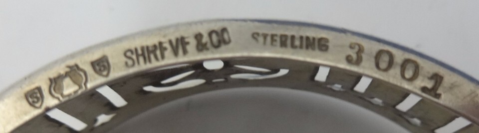 Winchester by Shreve sterling silver ramekin cup holder with a scrolly monogram (see photo). It is marked with #3001, measures 1 1/4" tall and 5 1/4" x 3", and weighs 1.2 ozt. No liner included. It is in excellent condition.