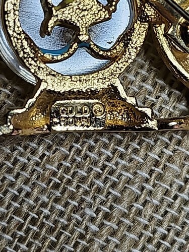 This vintage brooch from Gold Crown features a charming cat sitting beside a goldfish bowl. The cat is crafted from durable metal and adorned with clear rhinestones, while the goldfish bowl is made from lucite. The brooch is yellow gold plated and measures 2.25 inches in length.