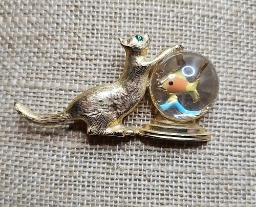 VTG Gold Crown Jelly Belly Kitty Cat Beside the Goldfish Fish Bowl Brooch 2.25"