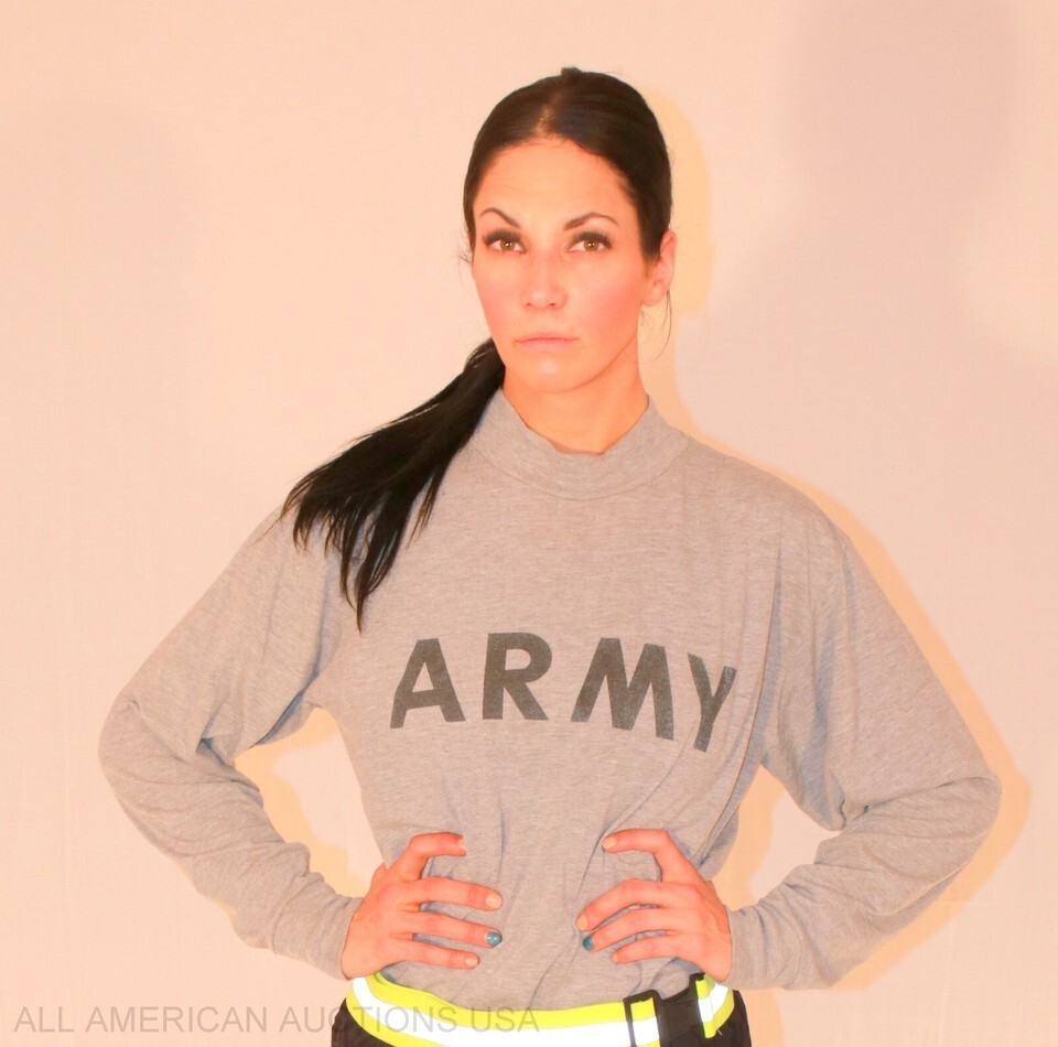 The Authentic OLD SCHOOL Army PT Long Sleeve Shirt for COLD Weather. This physical training (PT Gear) LONG sleeve t-shirt is athletic grey with "ARMY" on front and "A" on back in reflective screen printing ink.