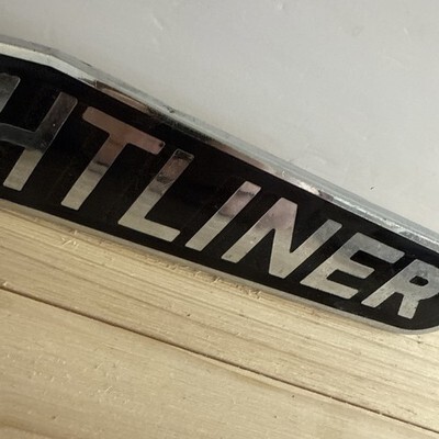 Genuine OEM Freightliner hood-side ?FREIGHTLINER? script badge removed from a late-1980s/1990s?early-2000s FLD120 / FLD112 Classic conventional.