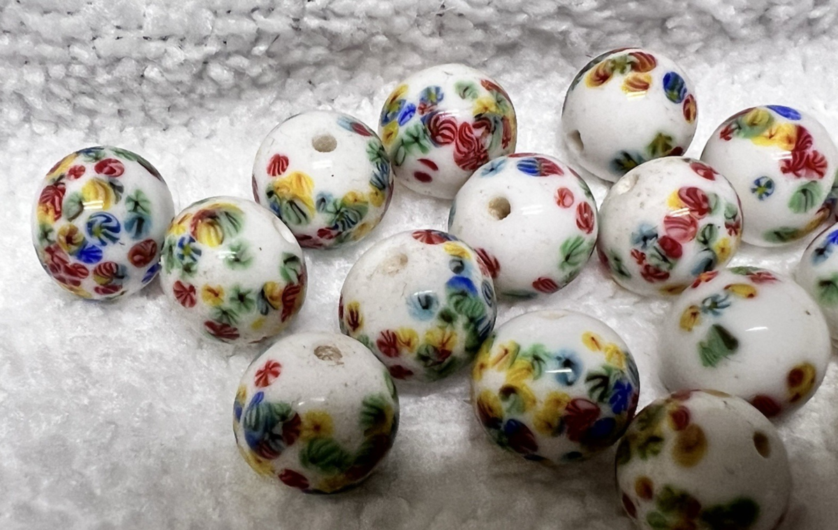 18 Vintage Art Glass Millefiori Beads White Glossy w Rainbow of Color 1/2 In RND