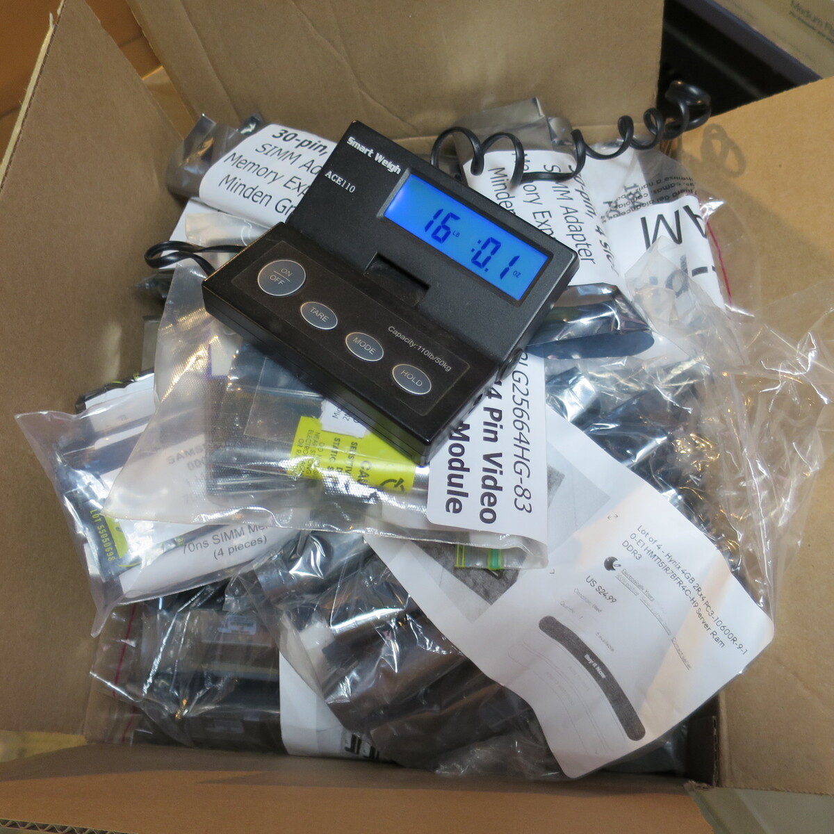 All of the ram together weighs slightly under 16 pounds (the cardboard box was tared out/subtracted in the attached weight photo).