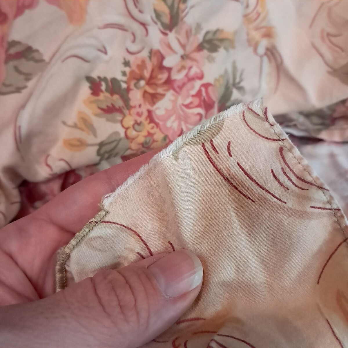 Full size with ruffle edge. One side of a ruffle edge is not serged as shown, otherwise Very good condition. No tag, but measures approx 88x100"