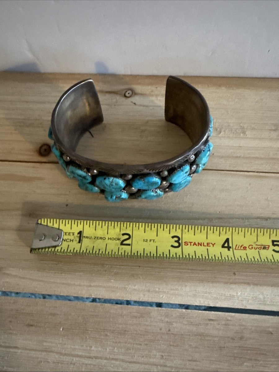Vintage Marc Antia Navajo sterling silver turquoise cluster cuff bracelet ? classic 1960s?1980s Native American jewelry at its finest.