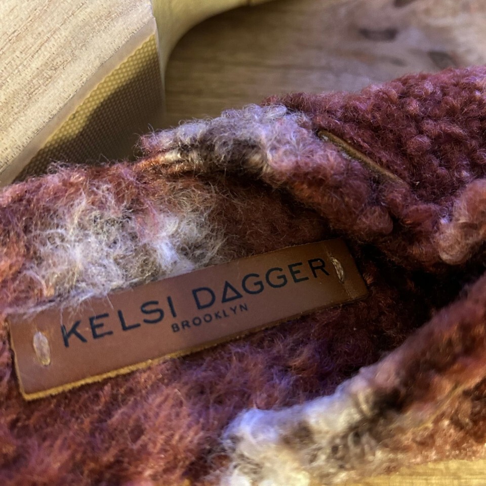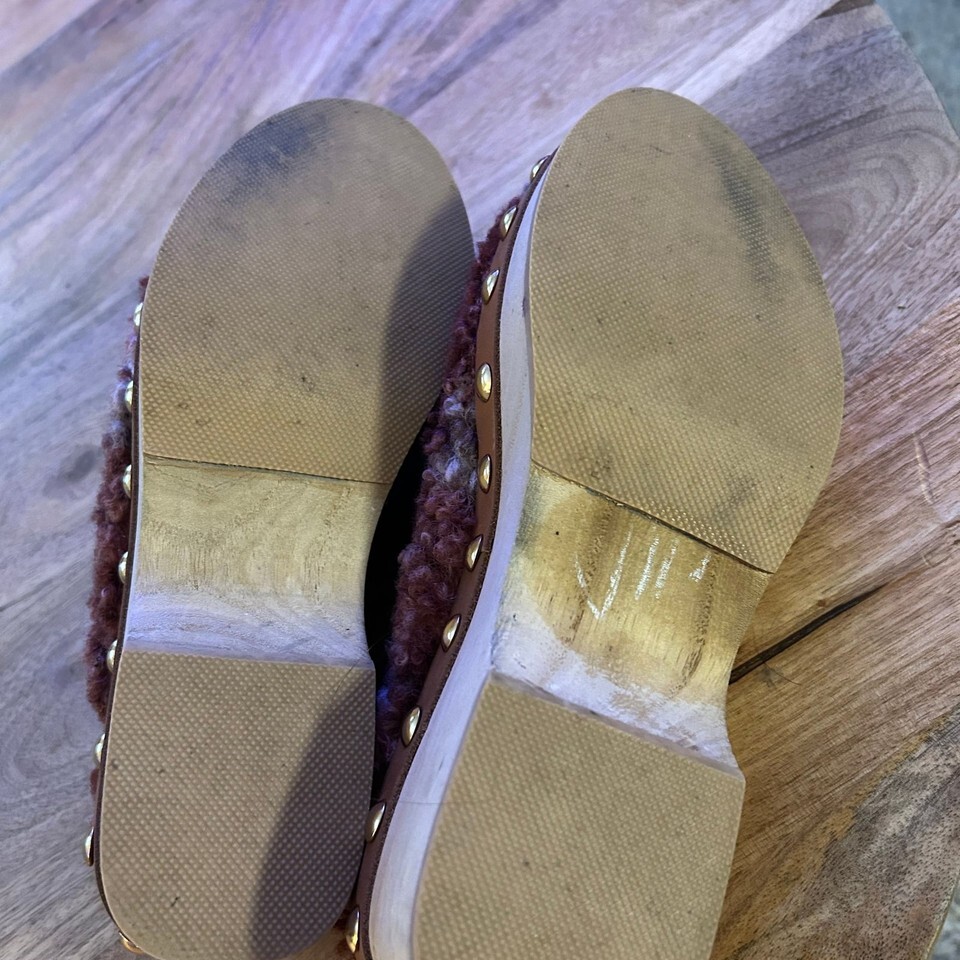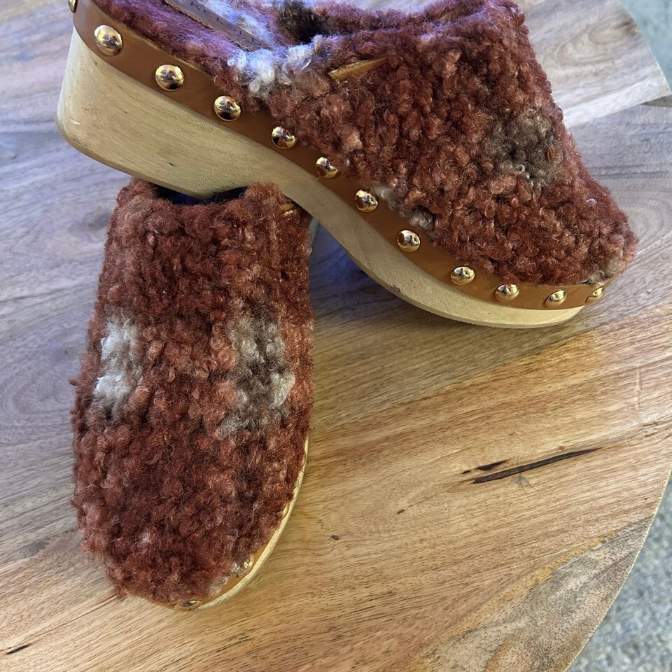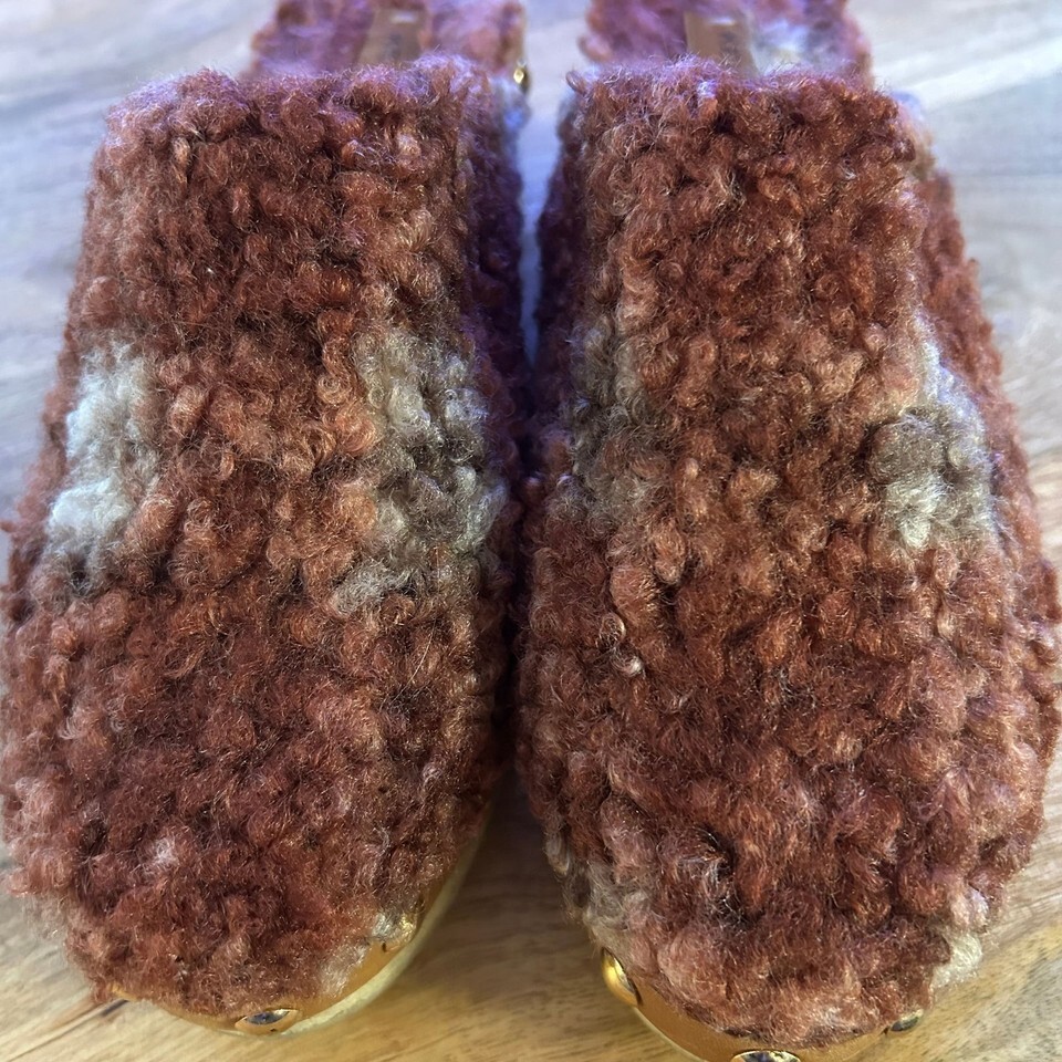 Step into cozy style with these Kelsi Dagger Brooklyn 'Logan' clogs. Featuring a plush burnt orange shearling upper with hints of lighter brown/grey, these mules offer both warmth and a unique textural appeal. The comfortable slip-on design makes them perfect for everyday wear. Excellent pre-owned condition.