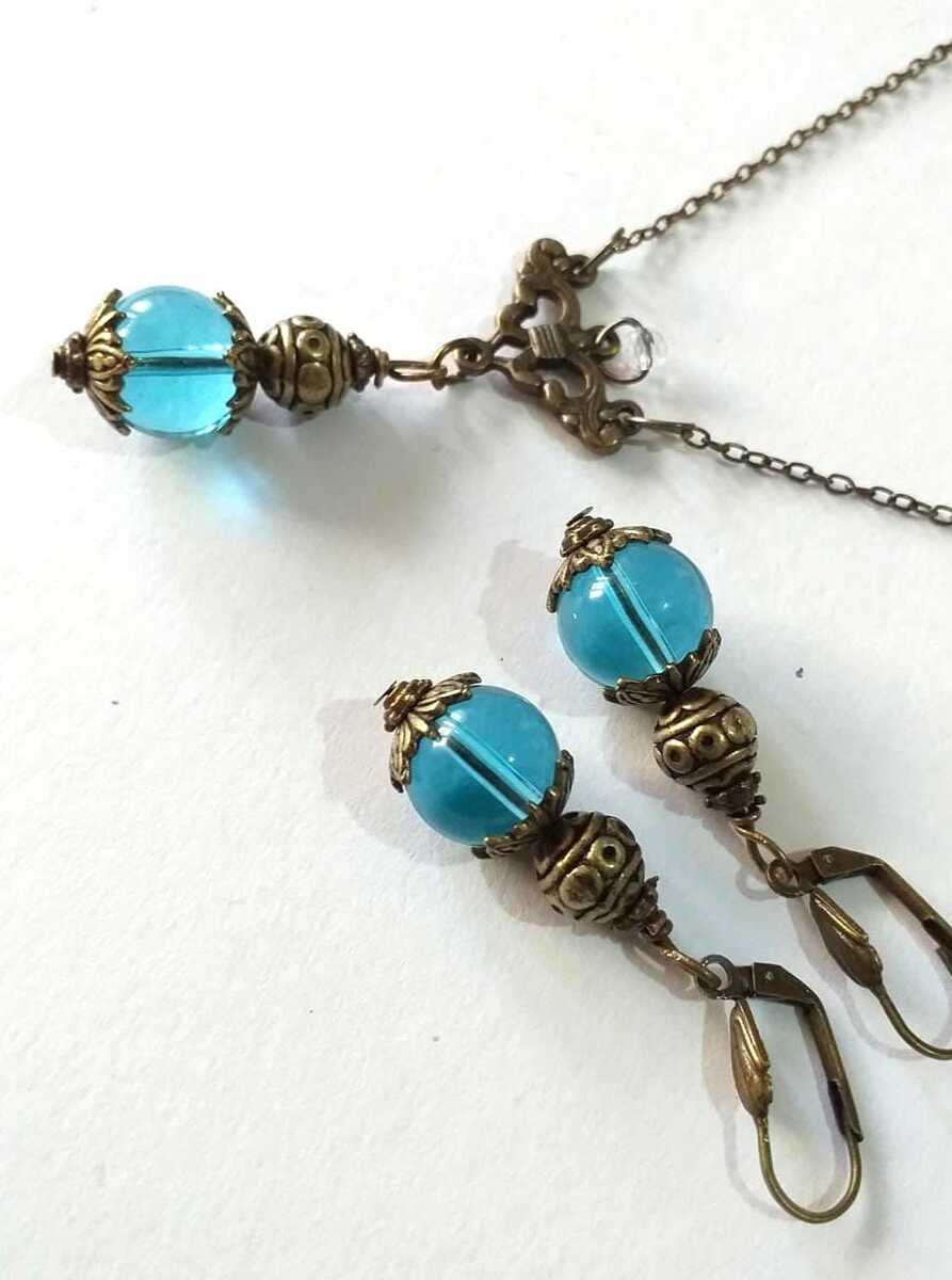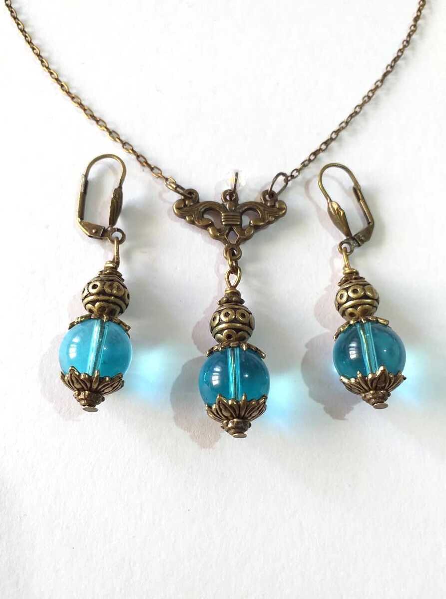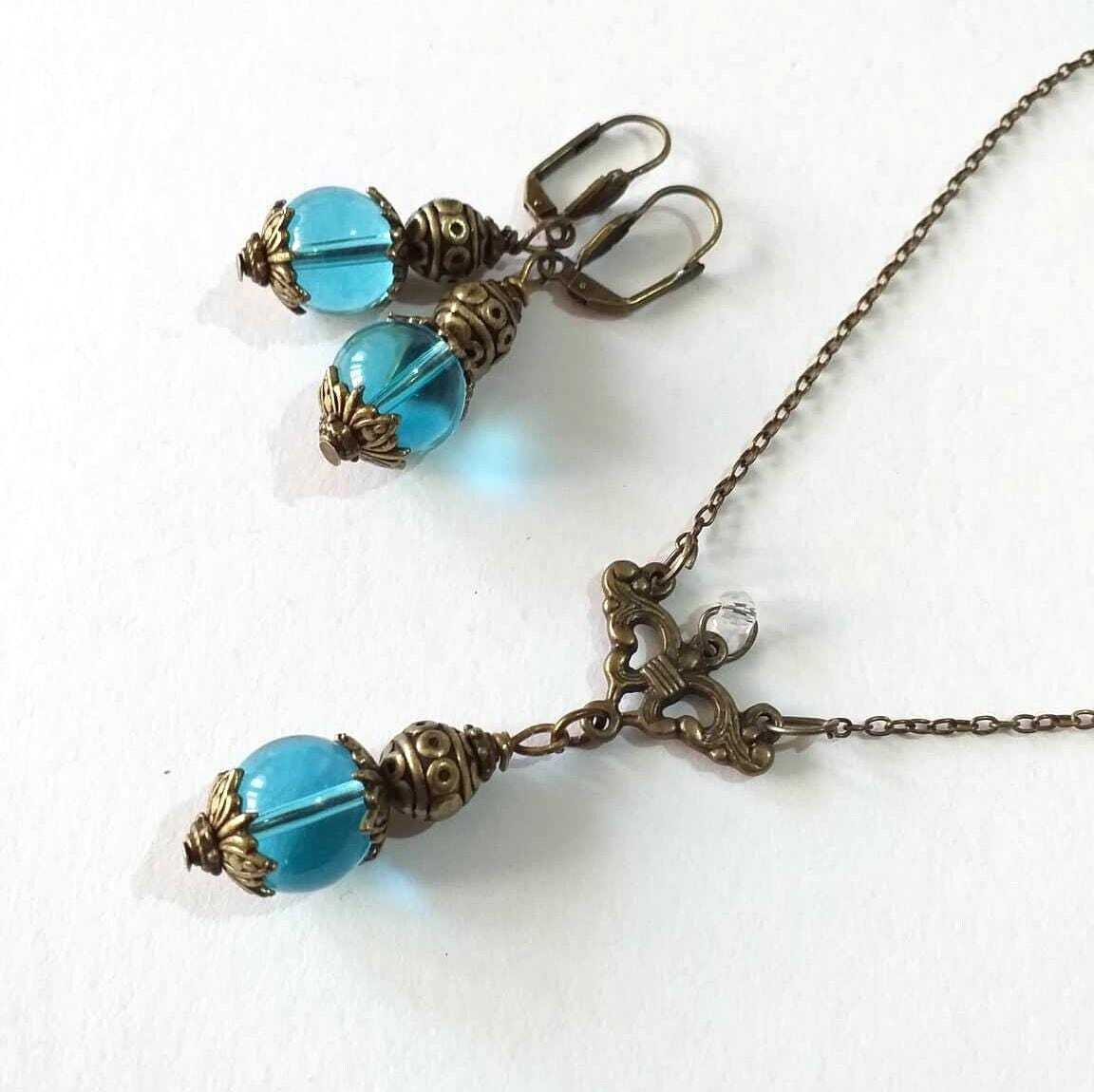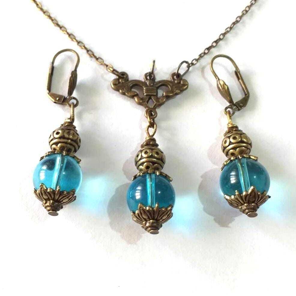 Victorian blue bronze jewelry set bohemian jewelry set earring necklace Boho set blue glass set antique set gift set blue bronze jewelry