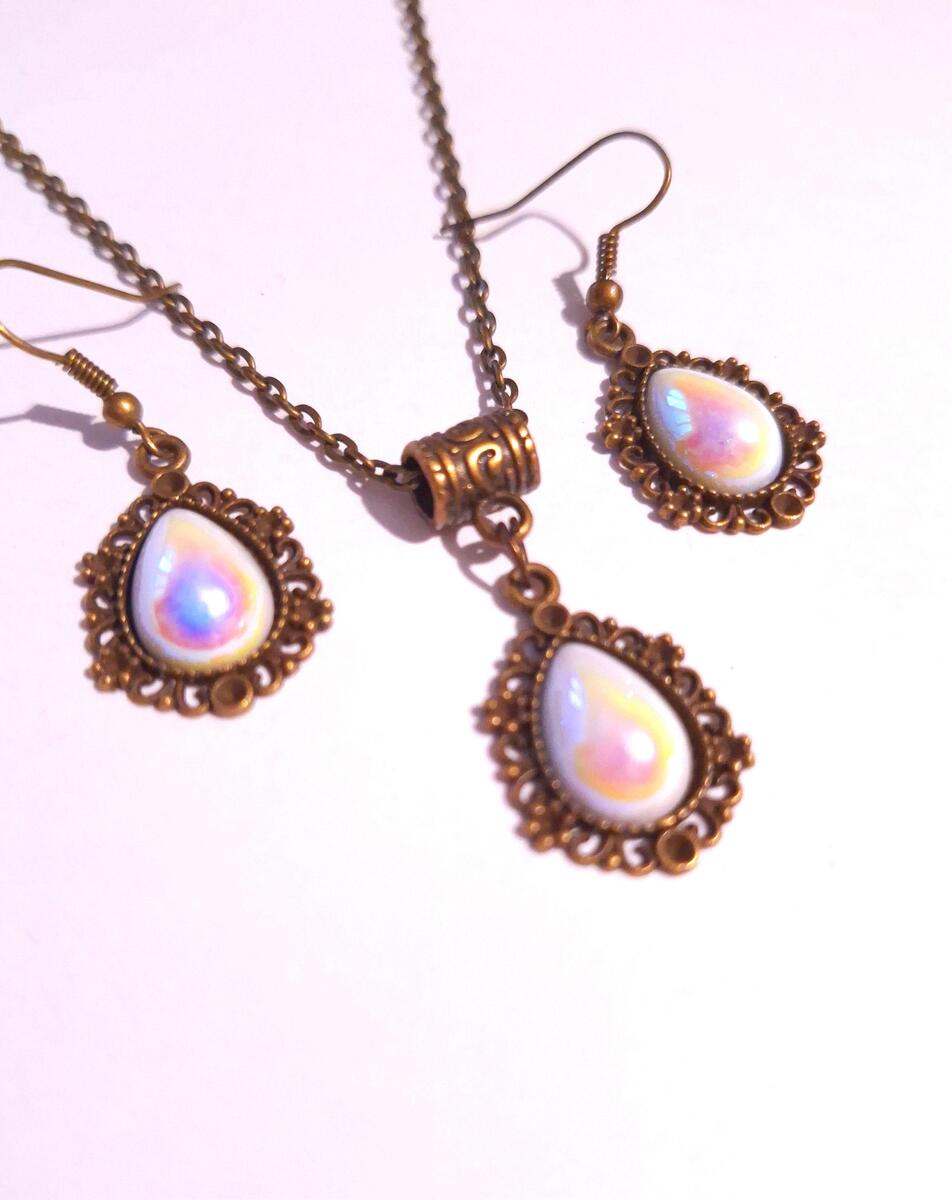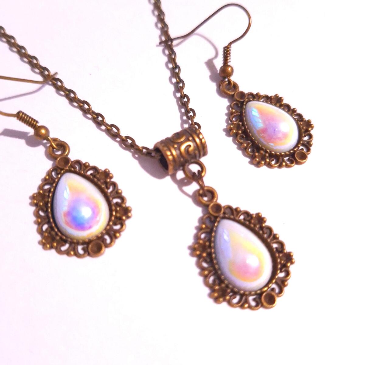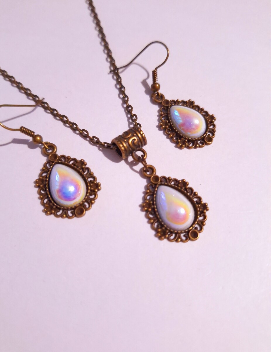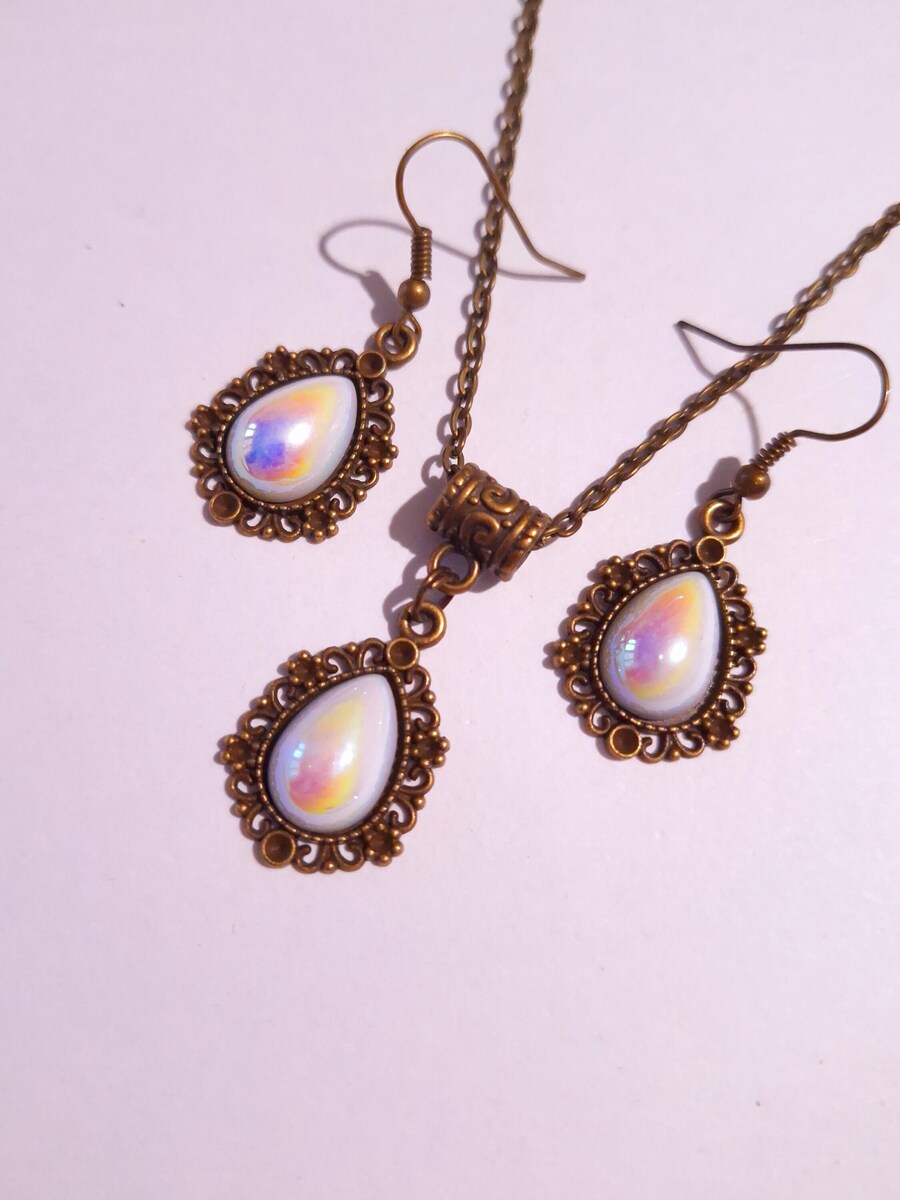 Beautiful Set of bronze-tone Antique style ornaments and pearl acrylic terdrop cabochon necklace and earrings. Bronze tone pendant Victorian style necklace and earrings. Boho necklace. Bohemian necklace and earrings. Gothic jewelry set. Romantic necklace and earrings. Beautiful necklace with same style earrings with Teardrop faux pearl acrylic cabochon.