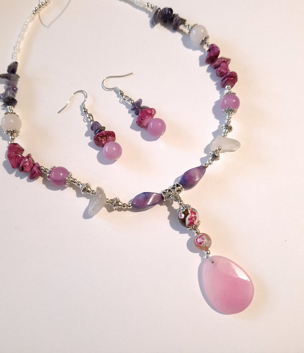 Amazingly beautiful large teardrop shape Pink Agate Victorian set silver-tone filigree necklace and earrings with many gemstones- pink and purple Agate, pink Jade, Rose quartz, pink Howlite, purple and white rough Amethyst. Bohemian necklace and earrings .