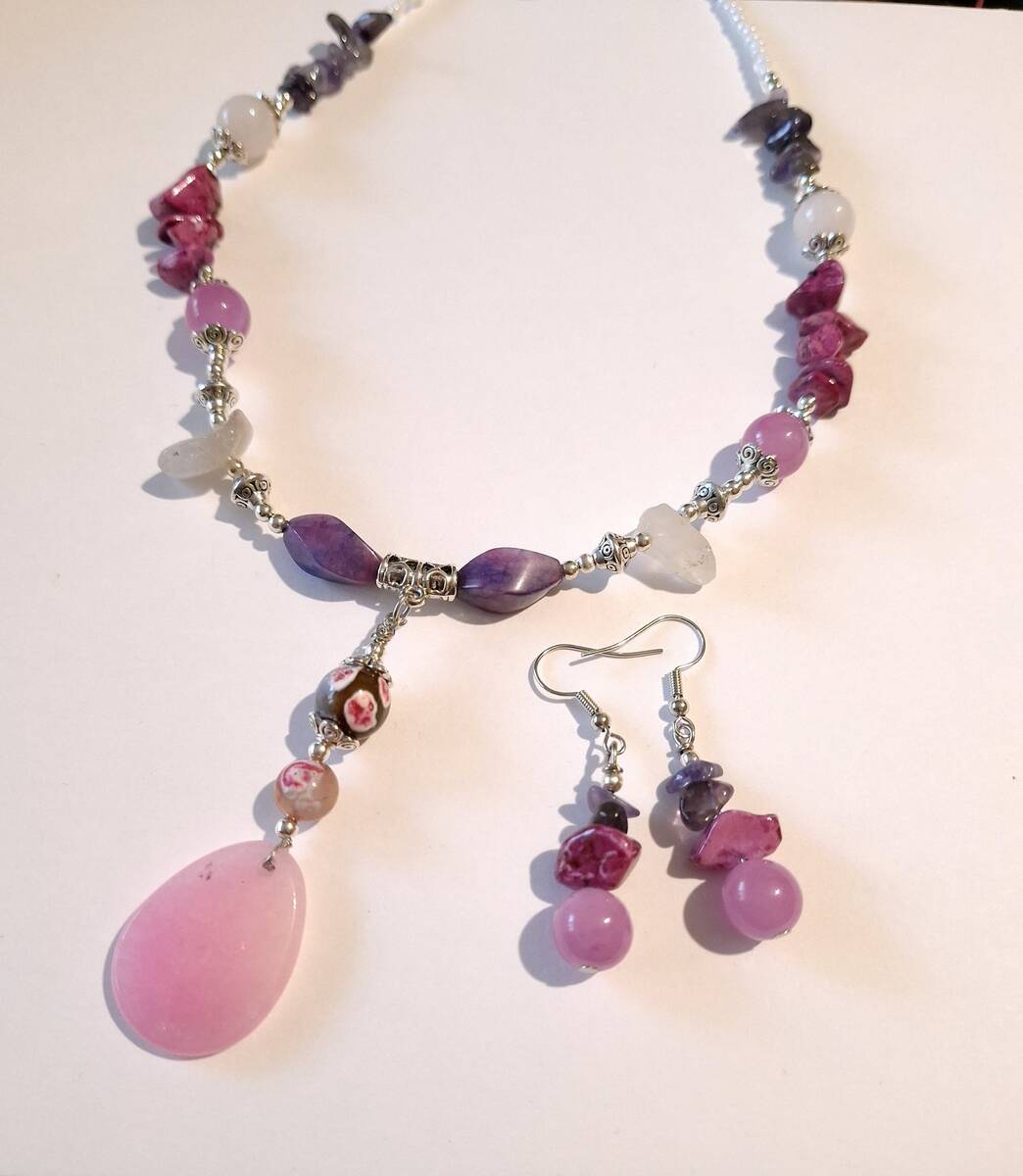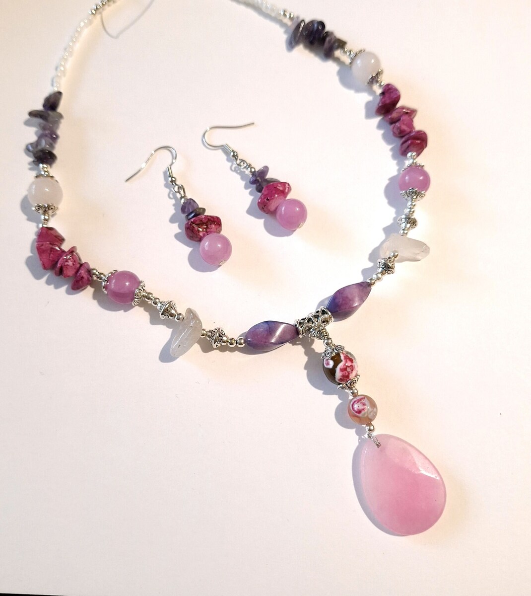 Pink Agate Purple agate pink Jade Rose quartz Pink Howlite purple and white rough Amethyst Silver jewelry set necklace earrings Victorian pink Agate jewelry set Boho set Silver filigree set Vintage Agate set gift jewelry