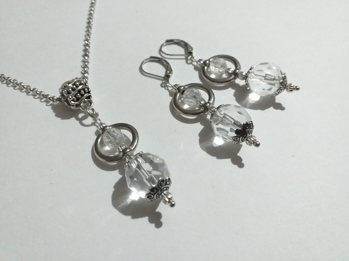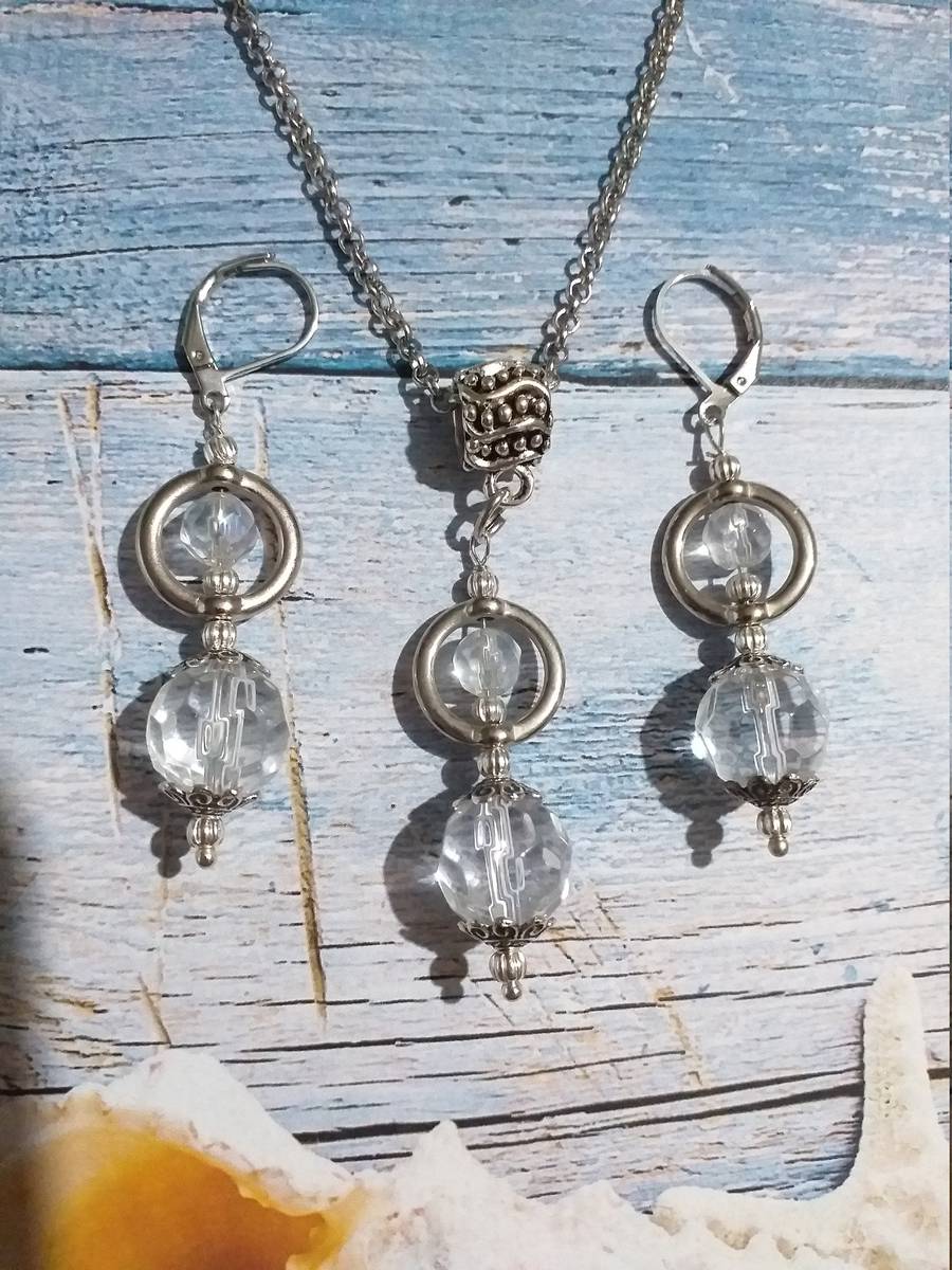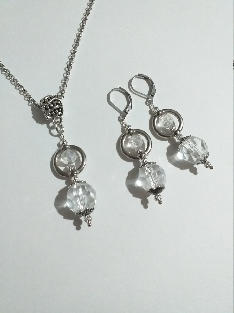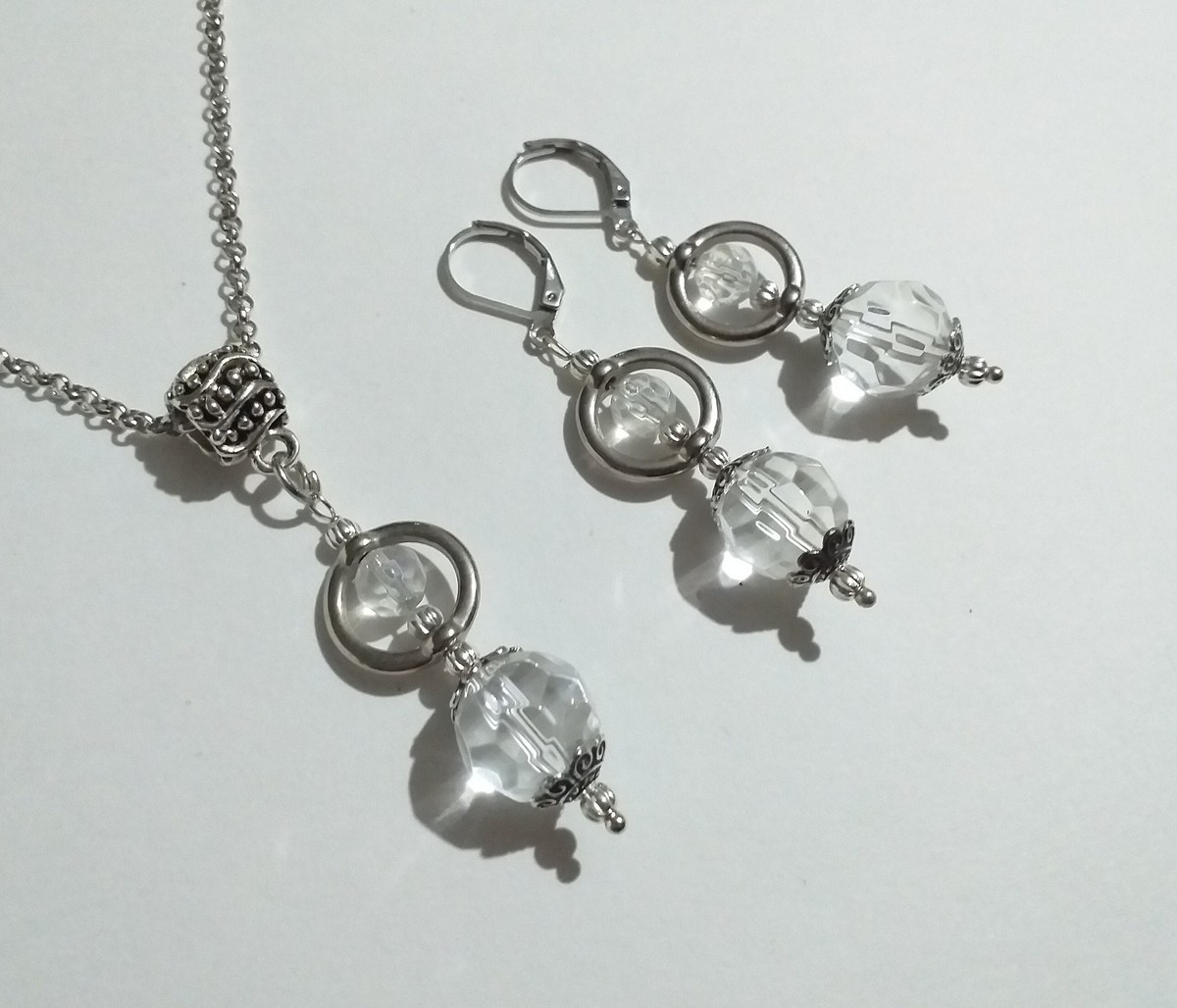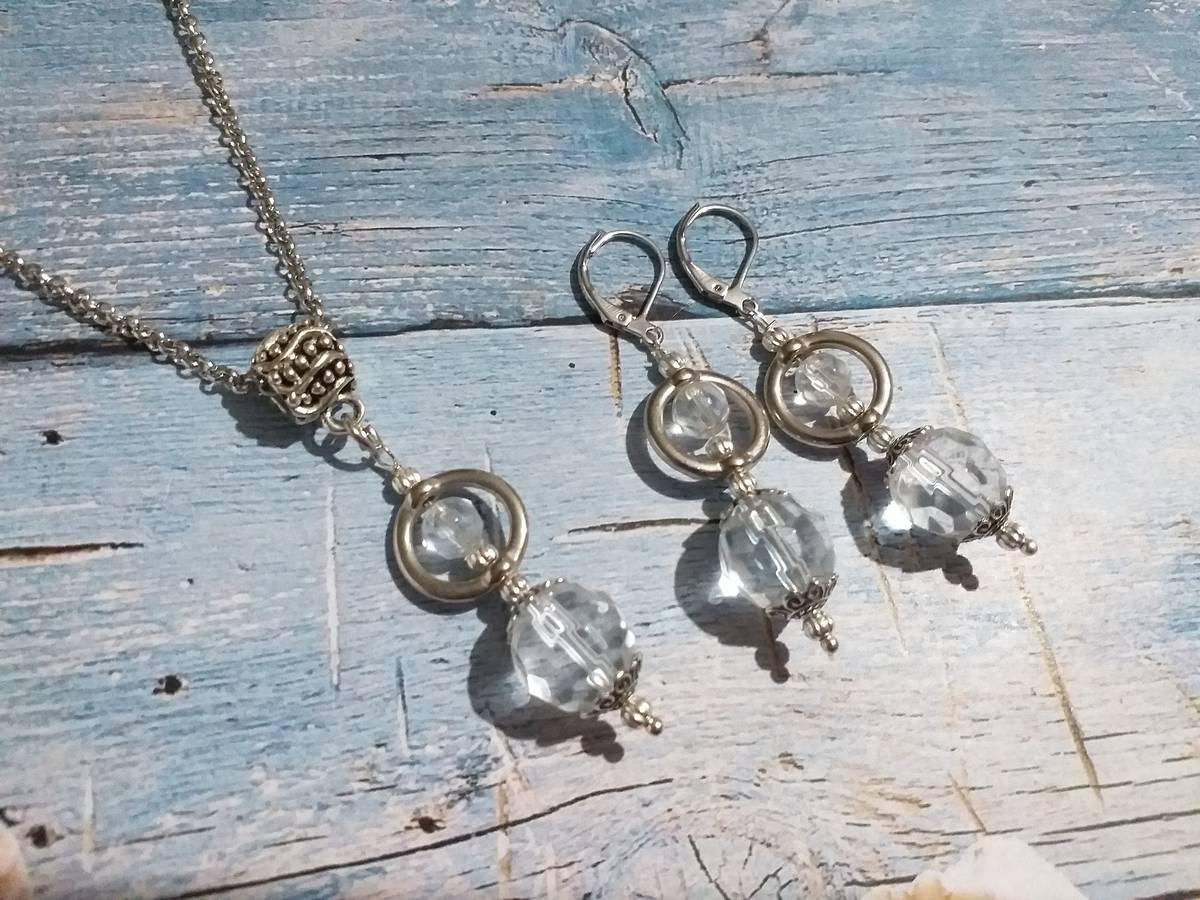 Beautiful Set of silver-tone plastic hoops with clear faceted glass beads inside necklace and earrings . Silver-tone pendant Victorian style necklace and earrings . Boho necklace . Bohemian necklace and earrings . Romantic necklace and earrings . Beautiful necklace with same style earrings with beautiful clear beads . Gift jewelry set.