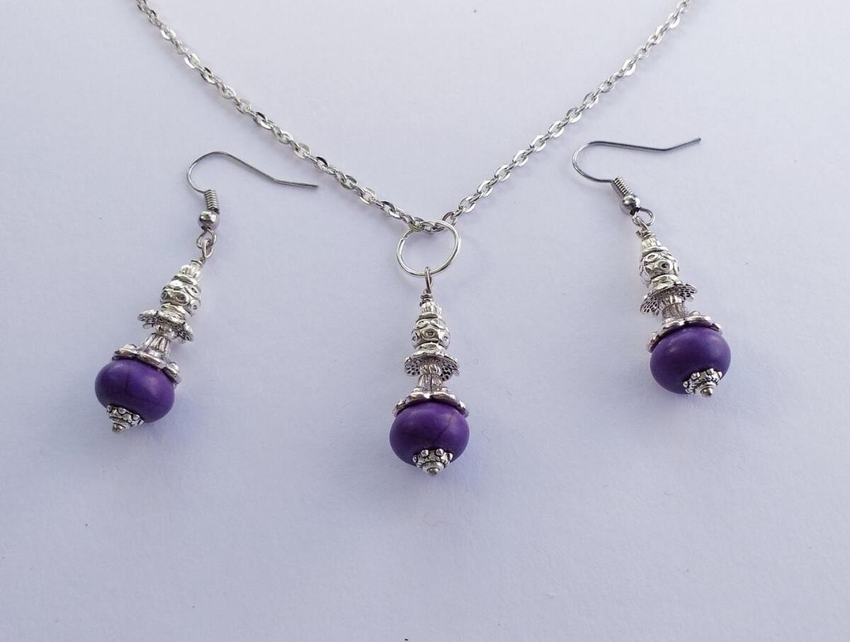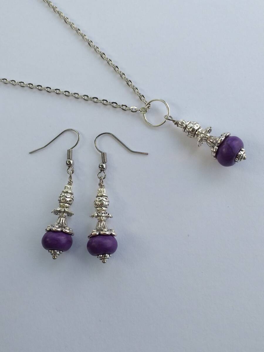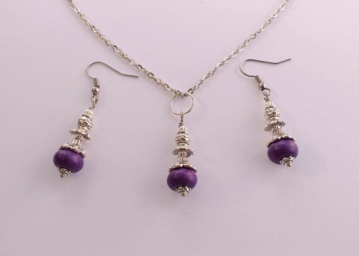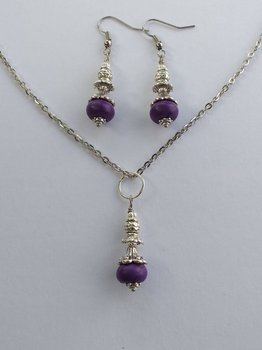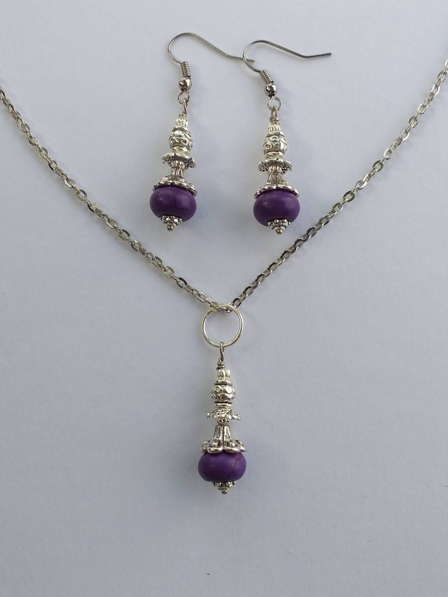 Beautiful Set of silver-tone Antique style and Purple Howlite stone necklace and earrings. Silver tone pendant Victorian style necklace and earrings. Boho necklace. Bohemian necklace and earrings. Romantic necklace and earrings. Beautiful necklace with same style earrings with Purple Howlite . Indigo tone jewelry set. Gypsy style jewelry set.