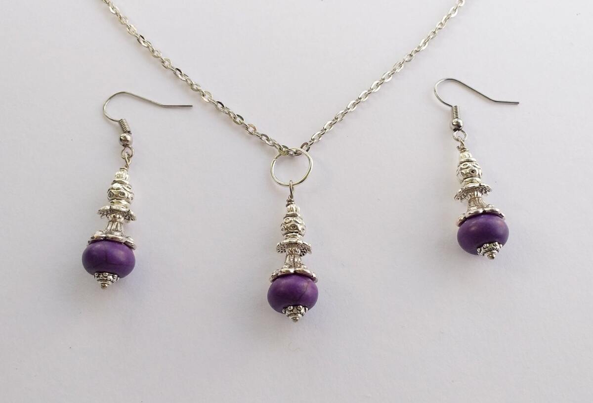 Purple Howlite Jewelry Set: Silver Tone Victorian Necklace Earrings