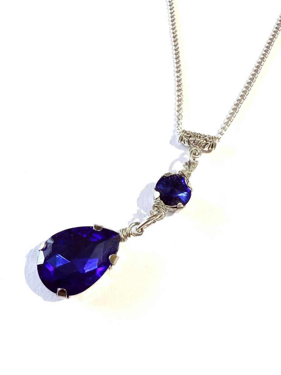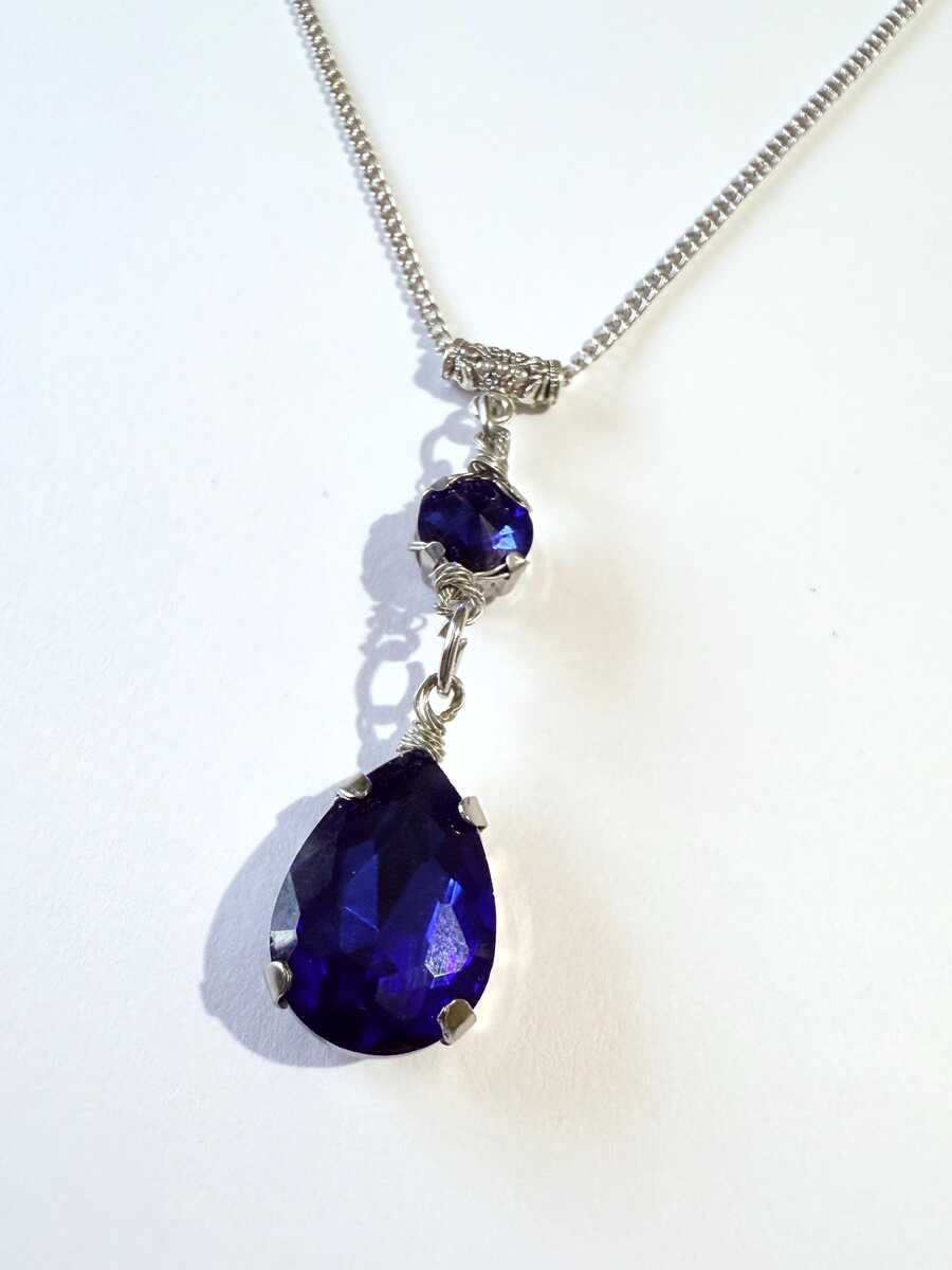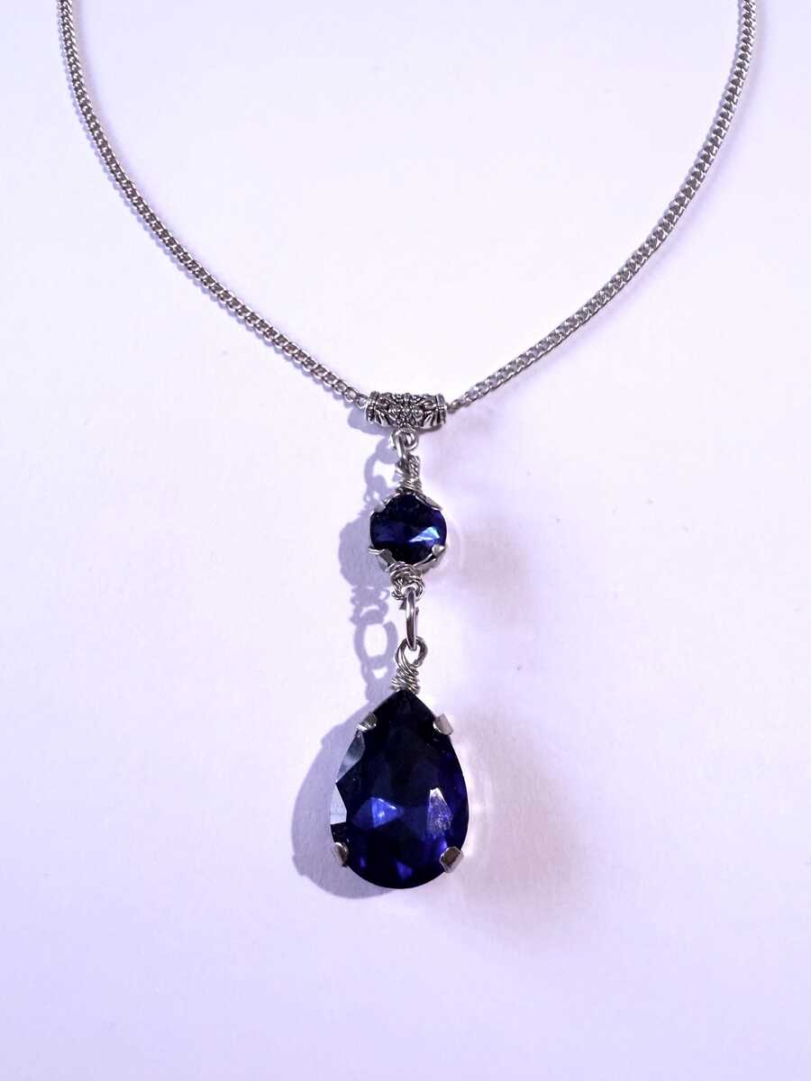 Material: silver toned metal ornaments , dark blue faceted teardrop and round glass cabochon, silver toned chain