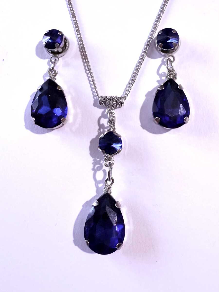 Beautiful Set of silver-tone Antique style dark blue round and teardrop shaped glass faceted cabochons on the silver-tone metal base necklace and earrings. Silver-tone pendant Victorian style necklace and earrings. Boho necklace. Bohemian necklace and earrings. Romantic necklace and earrings.
