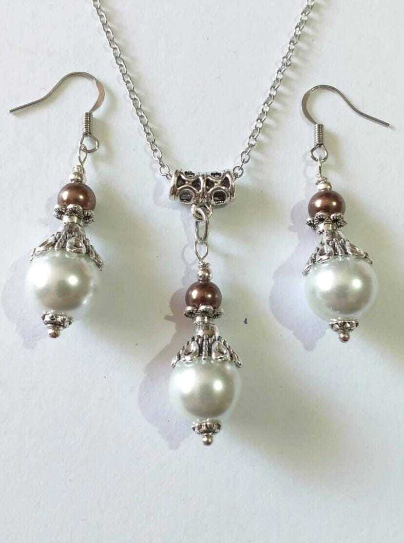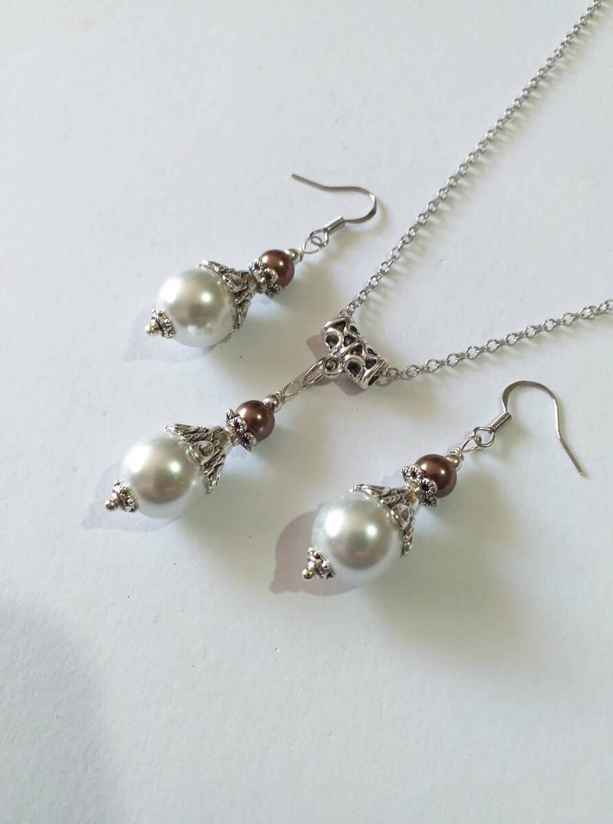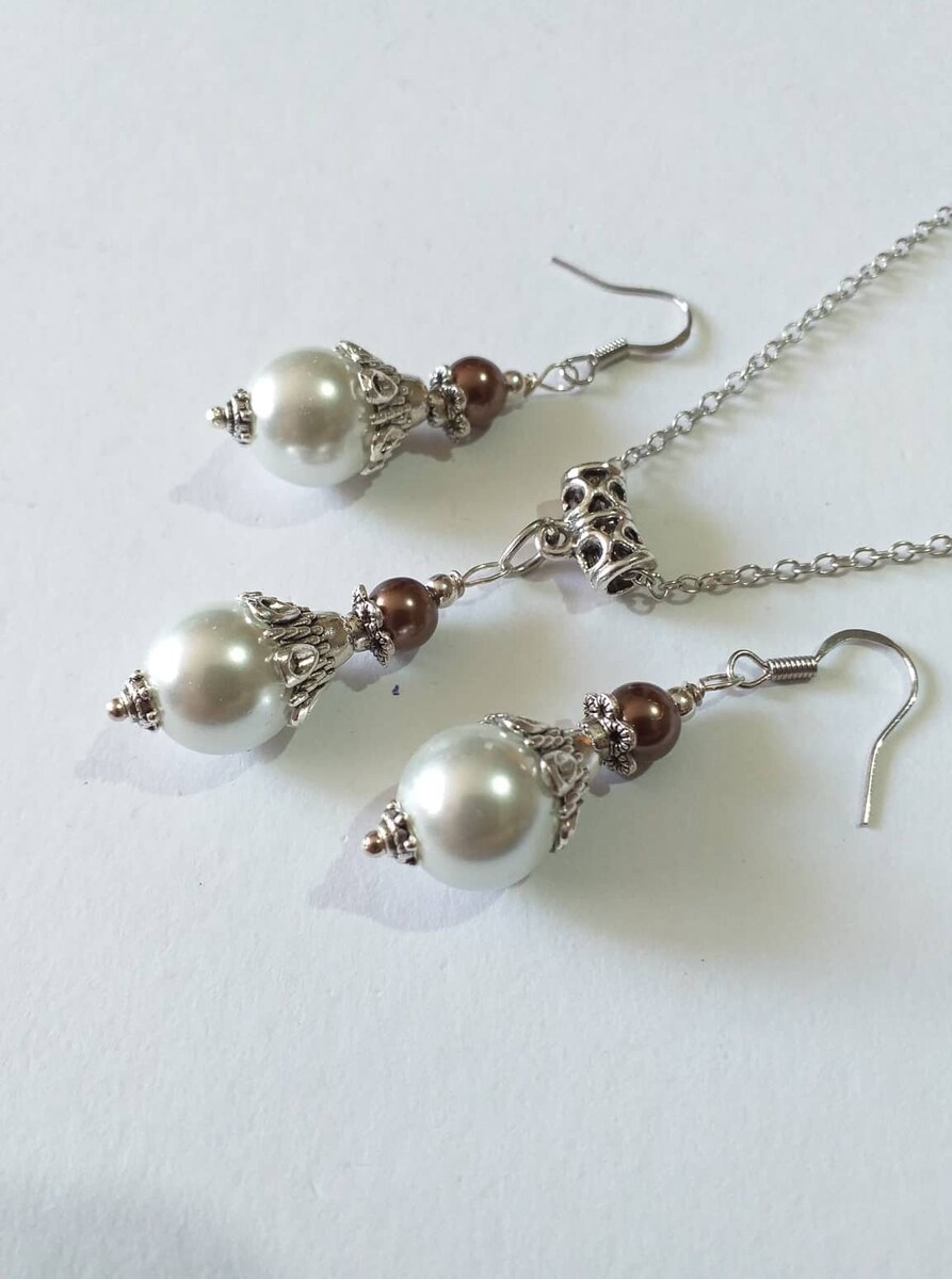 Beautiful Set of silver-tone Antique style ornaments and white and brown crystal pearls beads necklace and earrings . Silver tone Victorian style necklace and earrings . Boho necklace . Bohemian necklace and earrings . Romantic necklace and earrings . Beautiful necklace with same style earrings with white and brown crystal pearls beads.