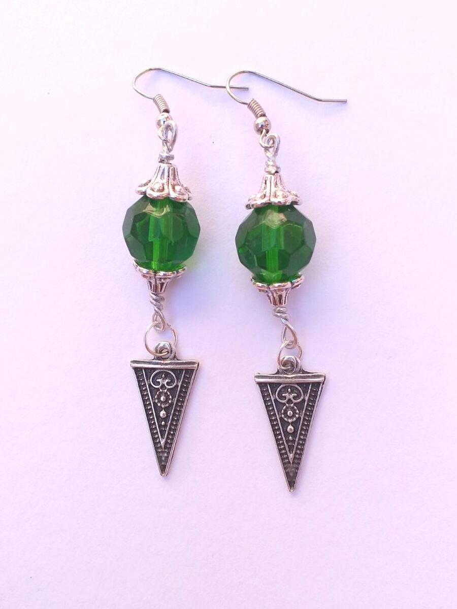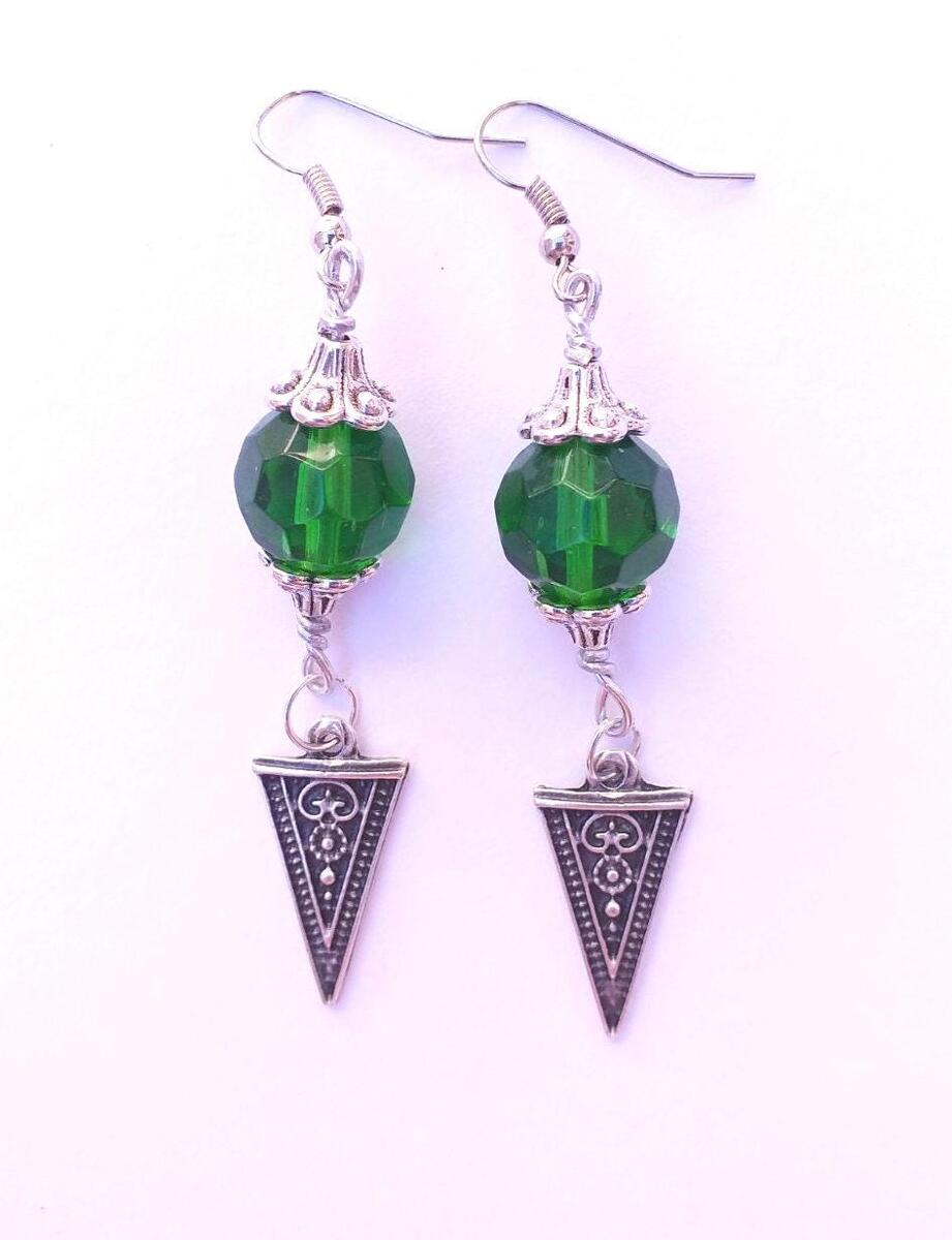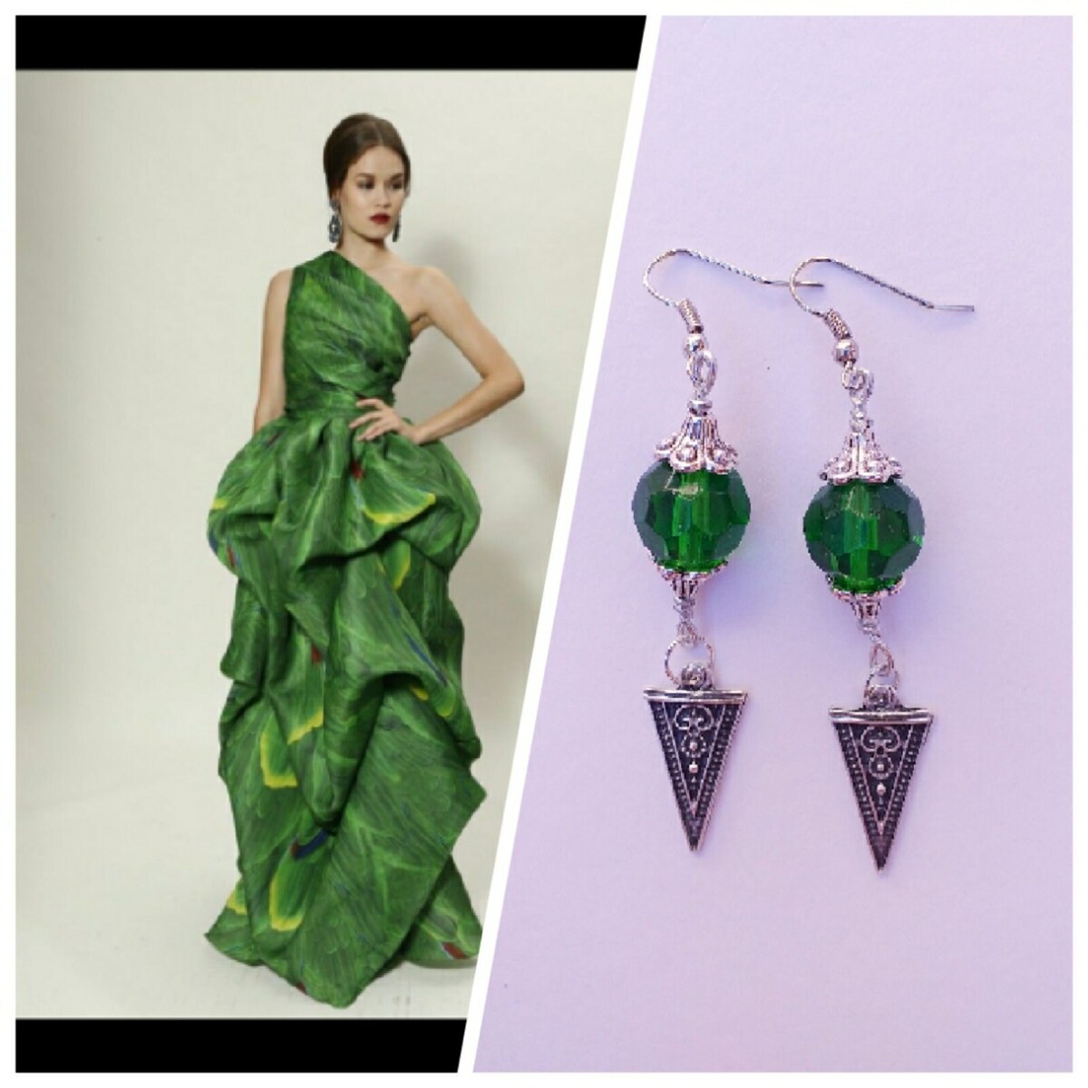 Victorian style silver-tone emerald green filigree earrings . Silver tone beautiful statement Boho earrings . Bohemian earrings . Victorian style silver tone emerald green glass faceted beads earrings . Modern earrings . Chic silver toned green earrings .