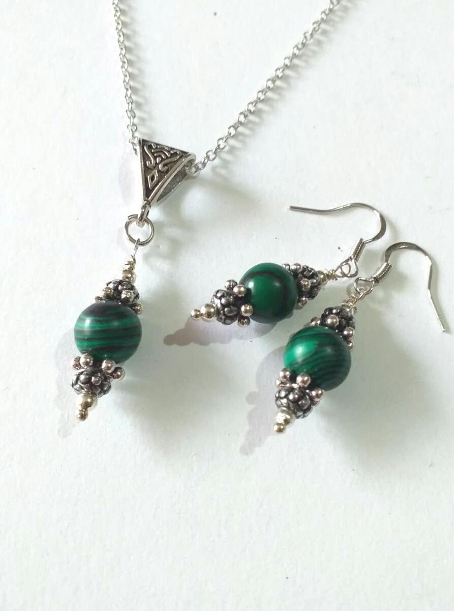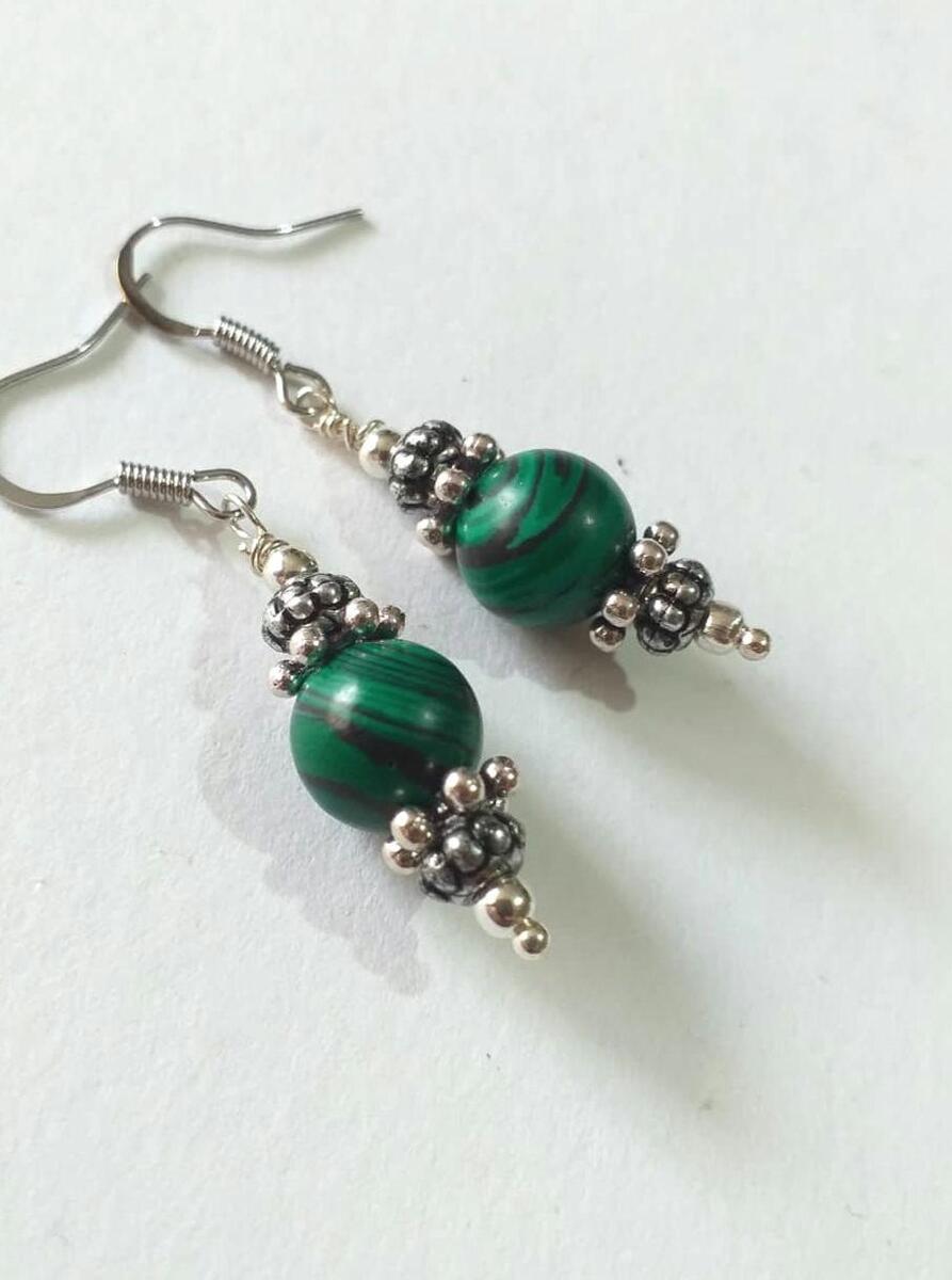 Amazingly beautiful Malachite earrings with silver-tone ornament beads. Victorian Malachite earrings . Silver-tone beautiful Boho earrings . Bohemian earrings . Victorian style silver-tone green Malachite gemstones dangle earrings with a beautiful ornamented silver-tone caps and plastic beads . Romantic Malachite earrings .