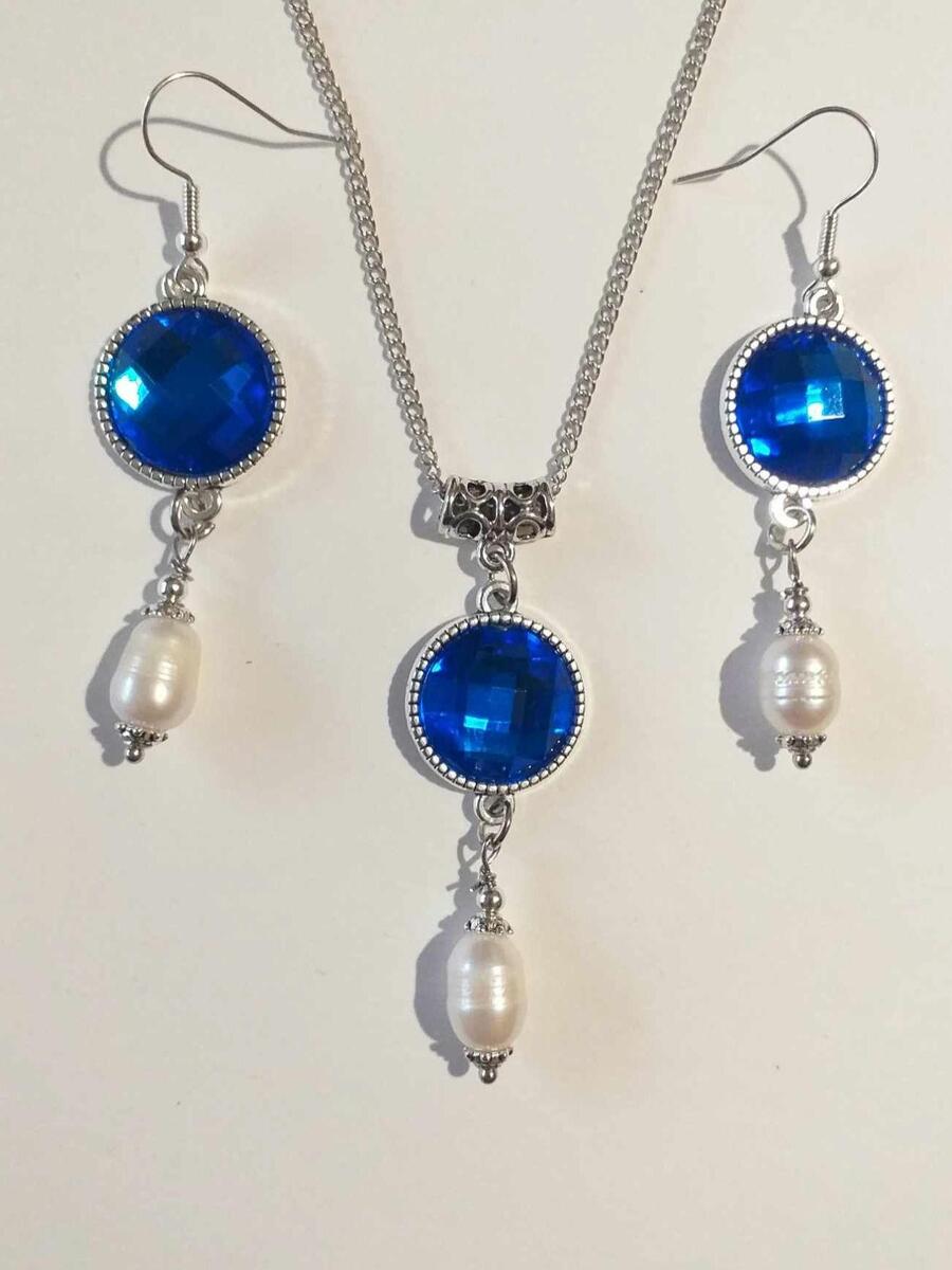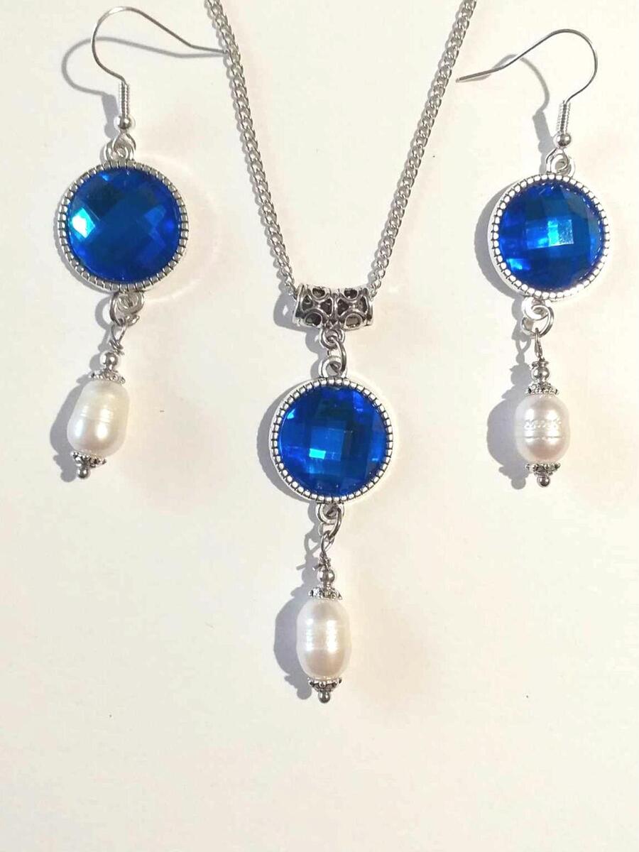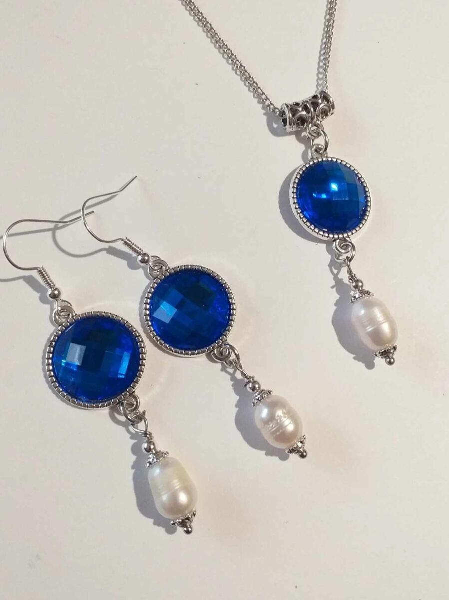 Beautiful Set of silver-tone Antique style dark Cobalt Blue and fine white genuine pearls necklace and earrings. Silver tone Victorian style necklace and earrings. Boho necklace. Bohemian necklace and earrings. Romantic necklace and earrings. Beautiful necklace with same style earrings with white pearls and dark Royal blue faux crystals acrylic cabochons.