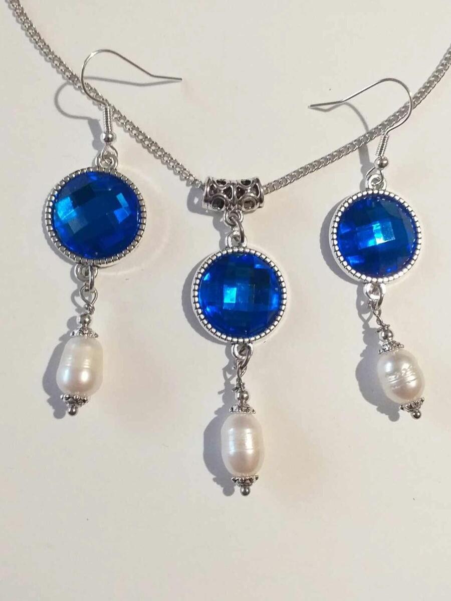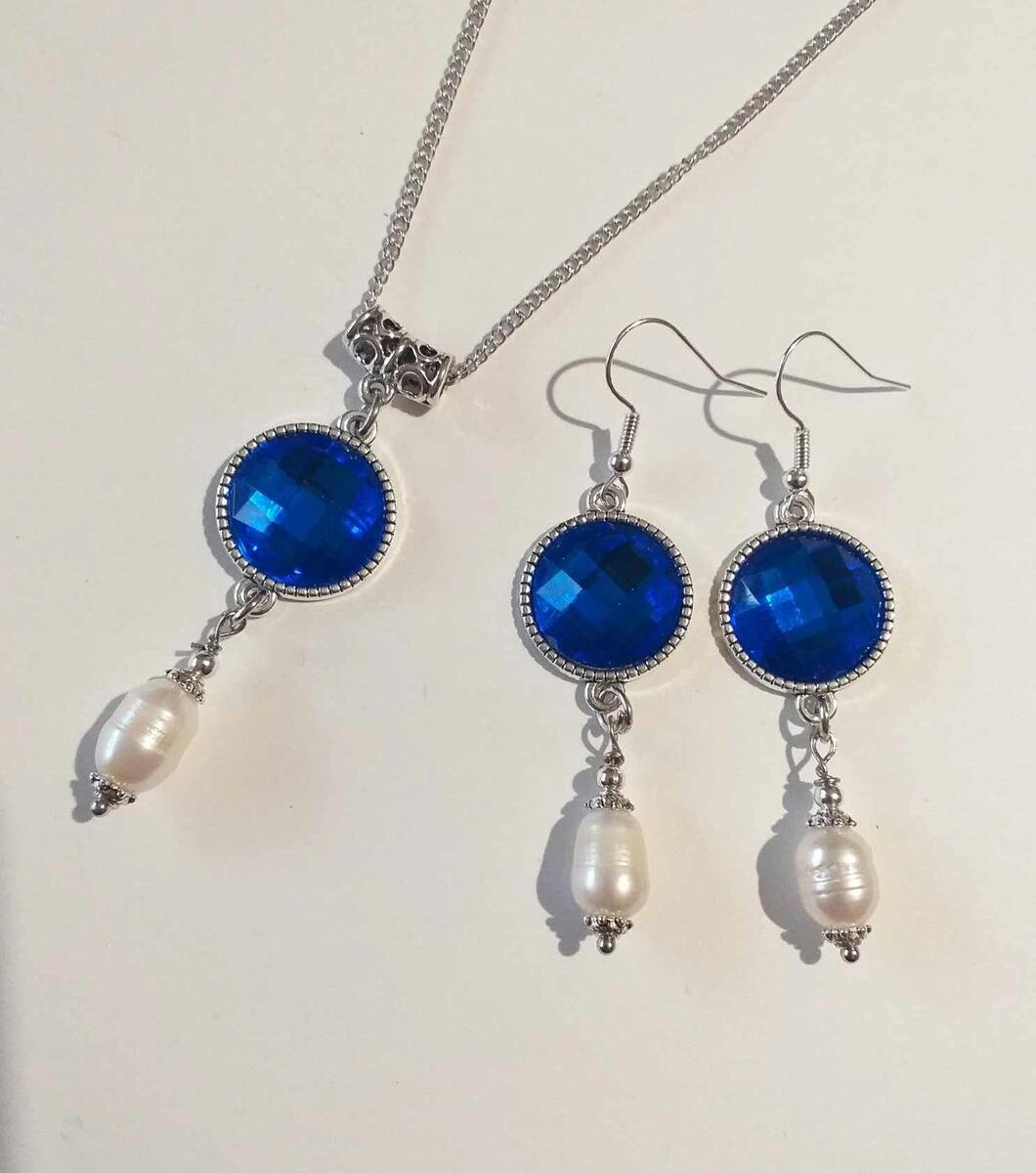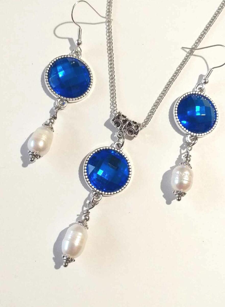 Pearl Cobalt blue Victorian Silver jewelry set Blue set necklace earrings Boho p