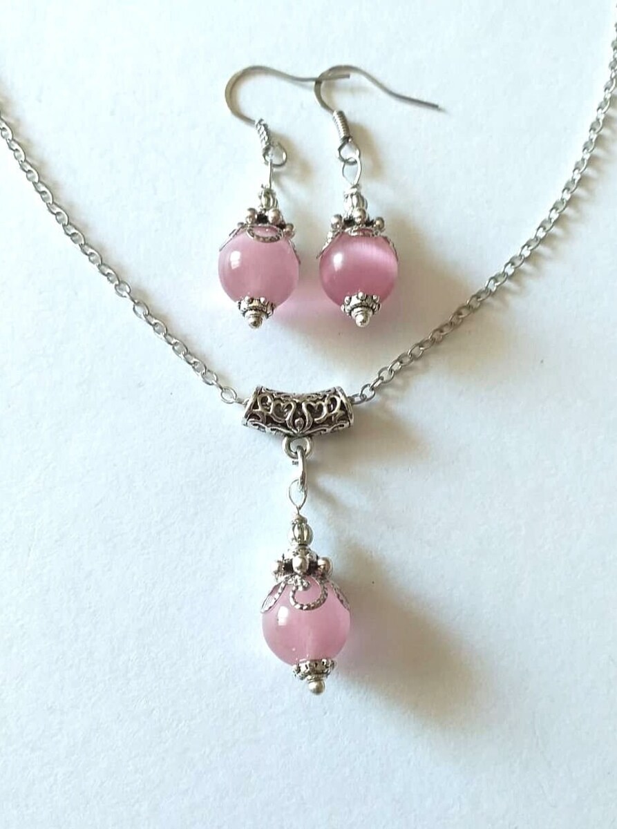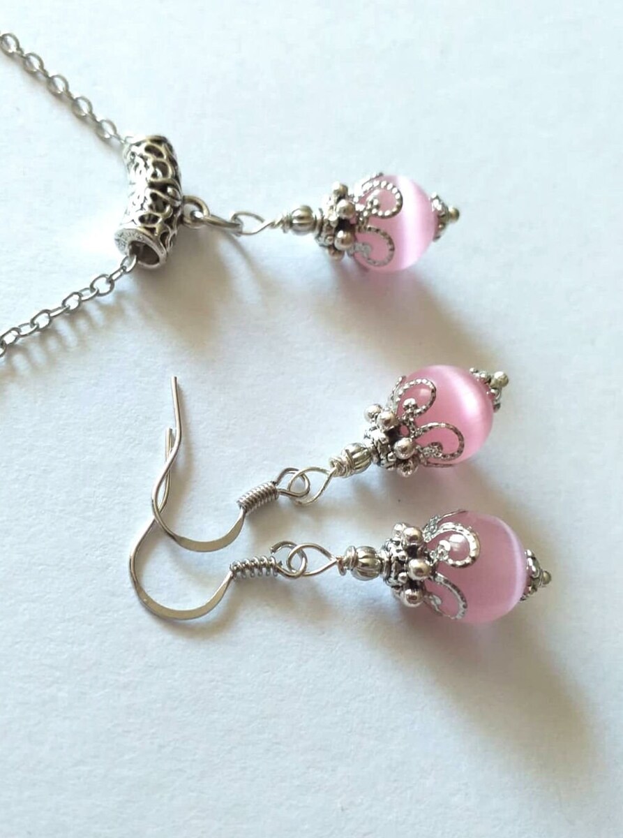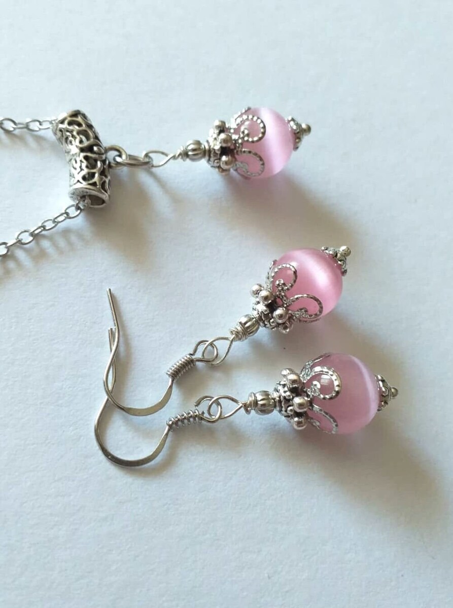 Beautiful Victorian Rose Pink gemstone Cat eye with filigree silver-tone ornaments jewelry set earrings and necklace. Cat eye earrings . Chrysoberyl Cat eye necklace. Chrysoberyl Cat eye jewelry set. Cat eye Dangle earrings . Boho jewelry set earrings and necklace . Bohemian jewelry set necklace and earrings . Rose pink Cat eye and silver-tone ornaments earrings and necklace jewelry set . Vintage style jewelry set . Antique style jewelry set.