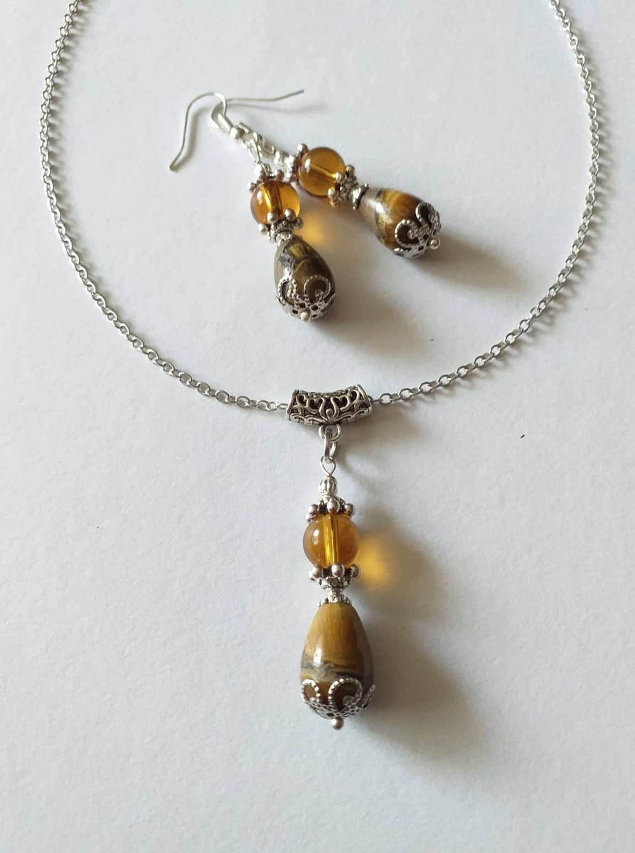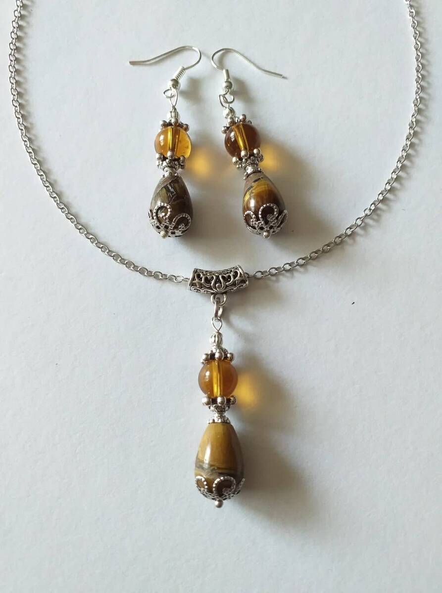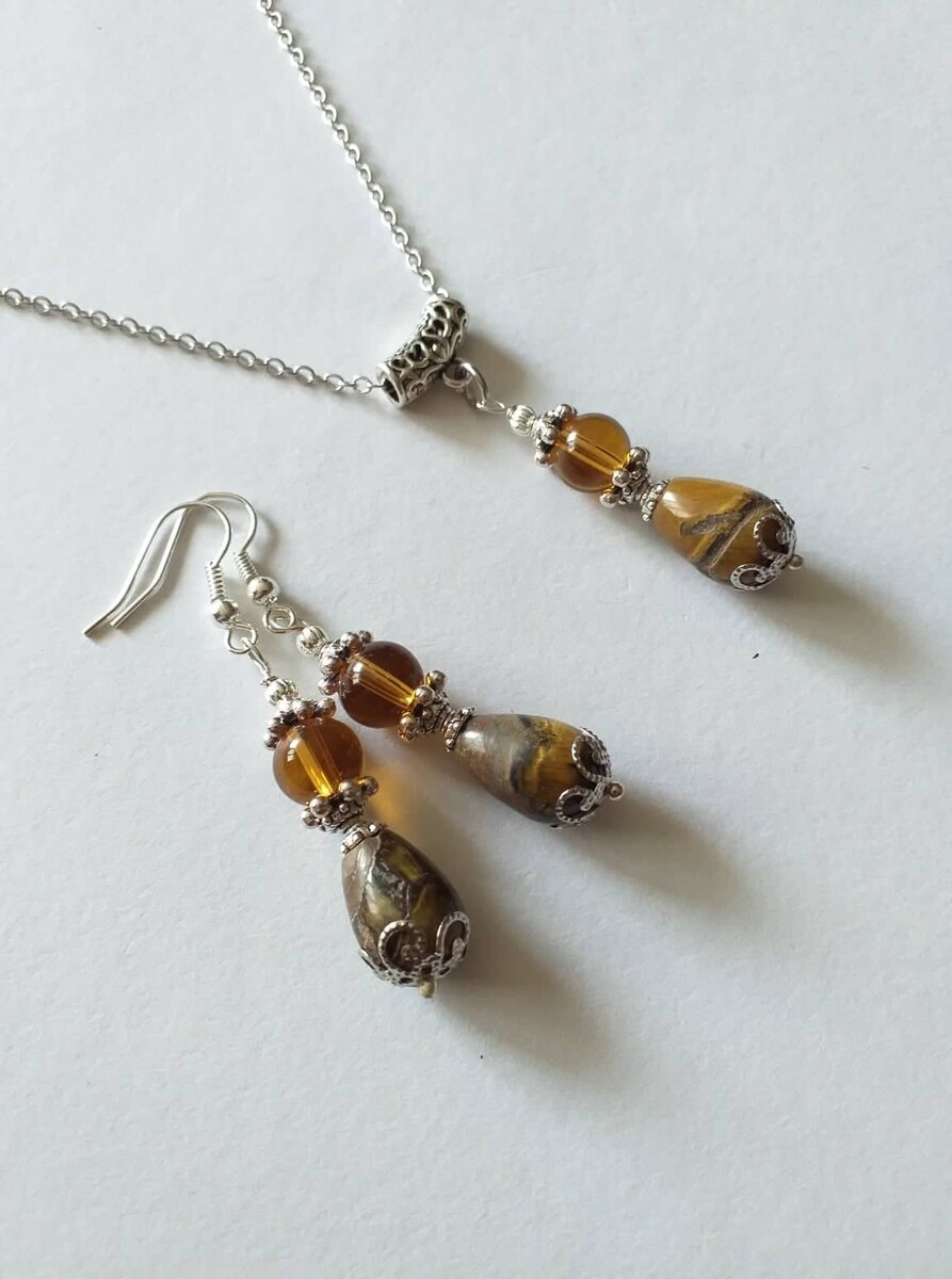 Tiger's eye Victorian jewelry set necklace and earrings . Bohemian jewelry set necklace and earrings .