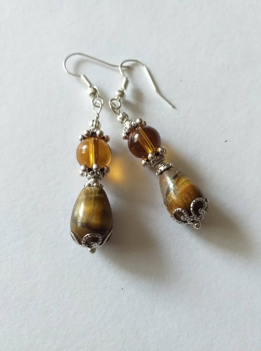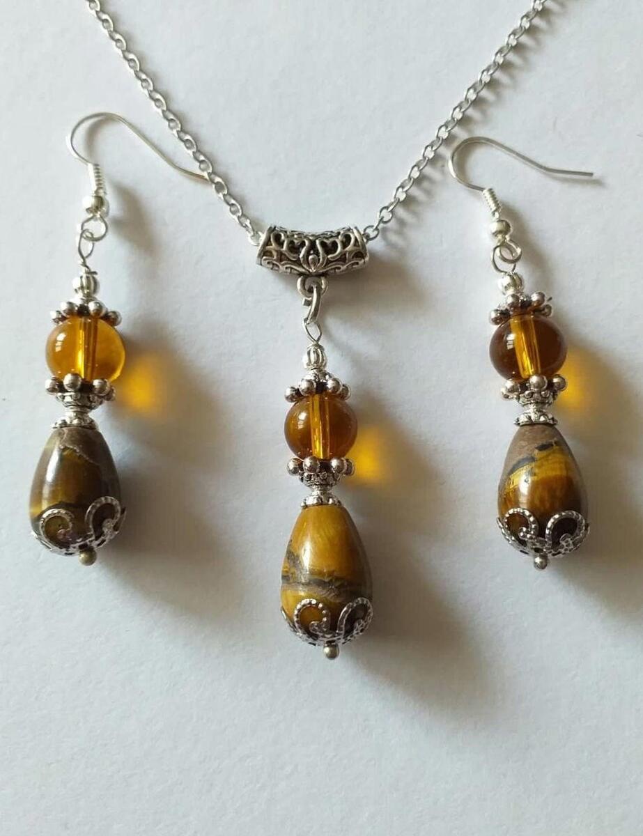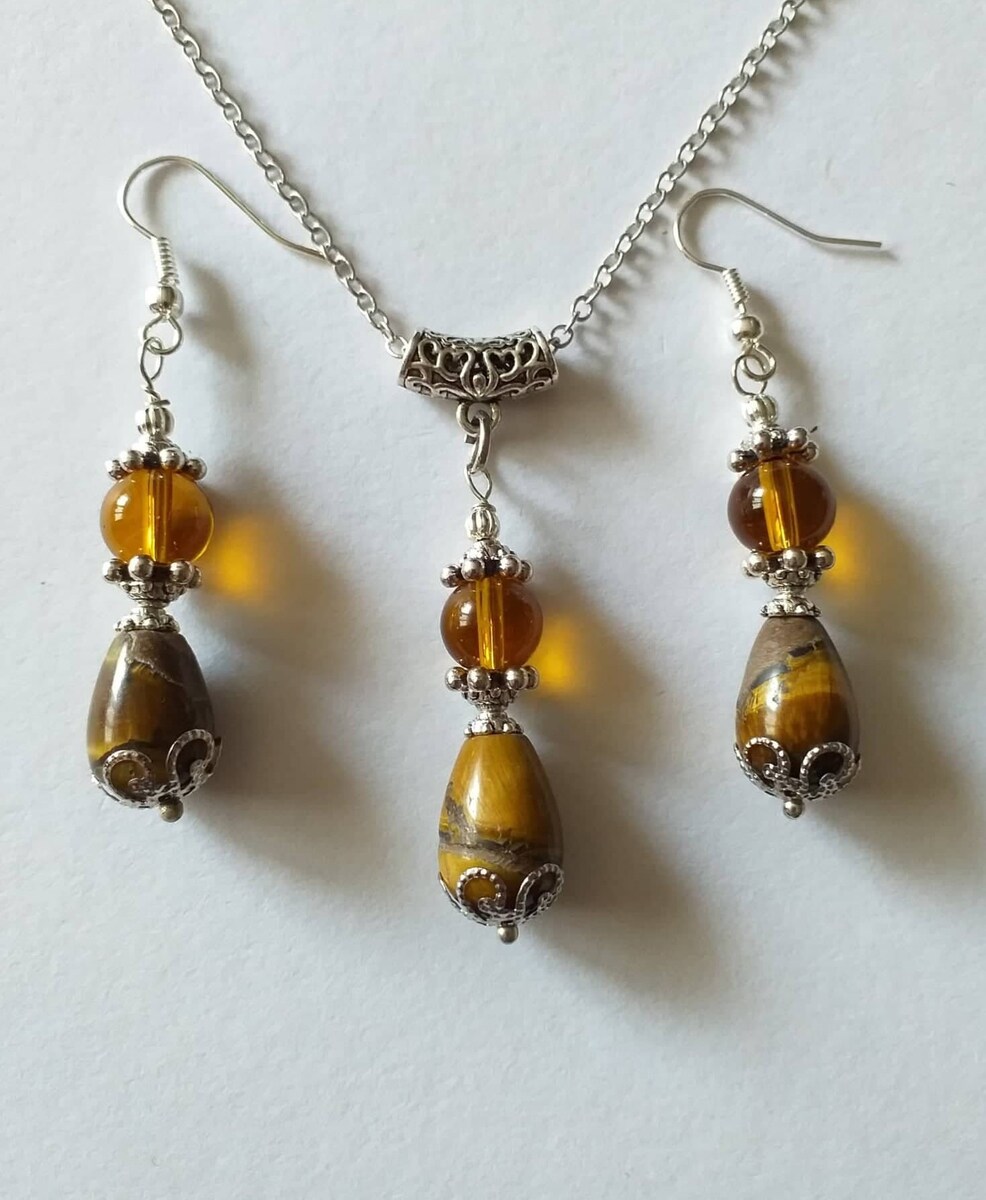 Tiger's eye Victorian jewelry set necklace and earrings . Bohemian jewelry set necklace and earrings .