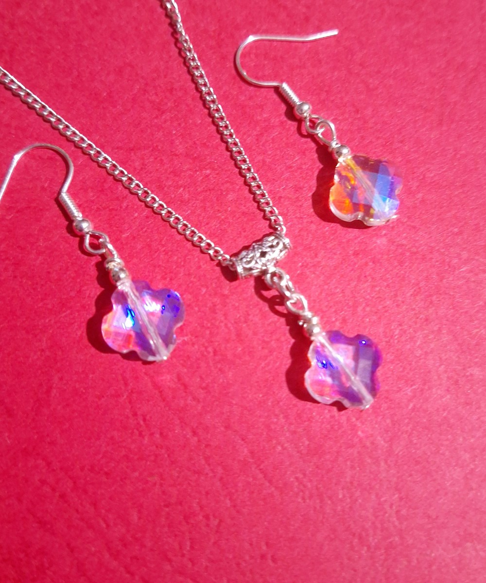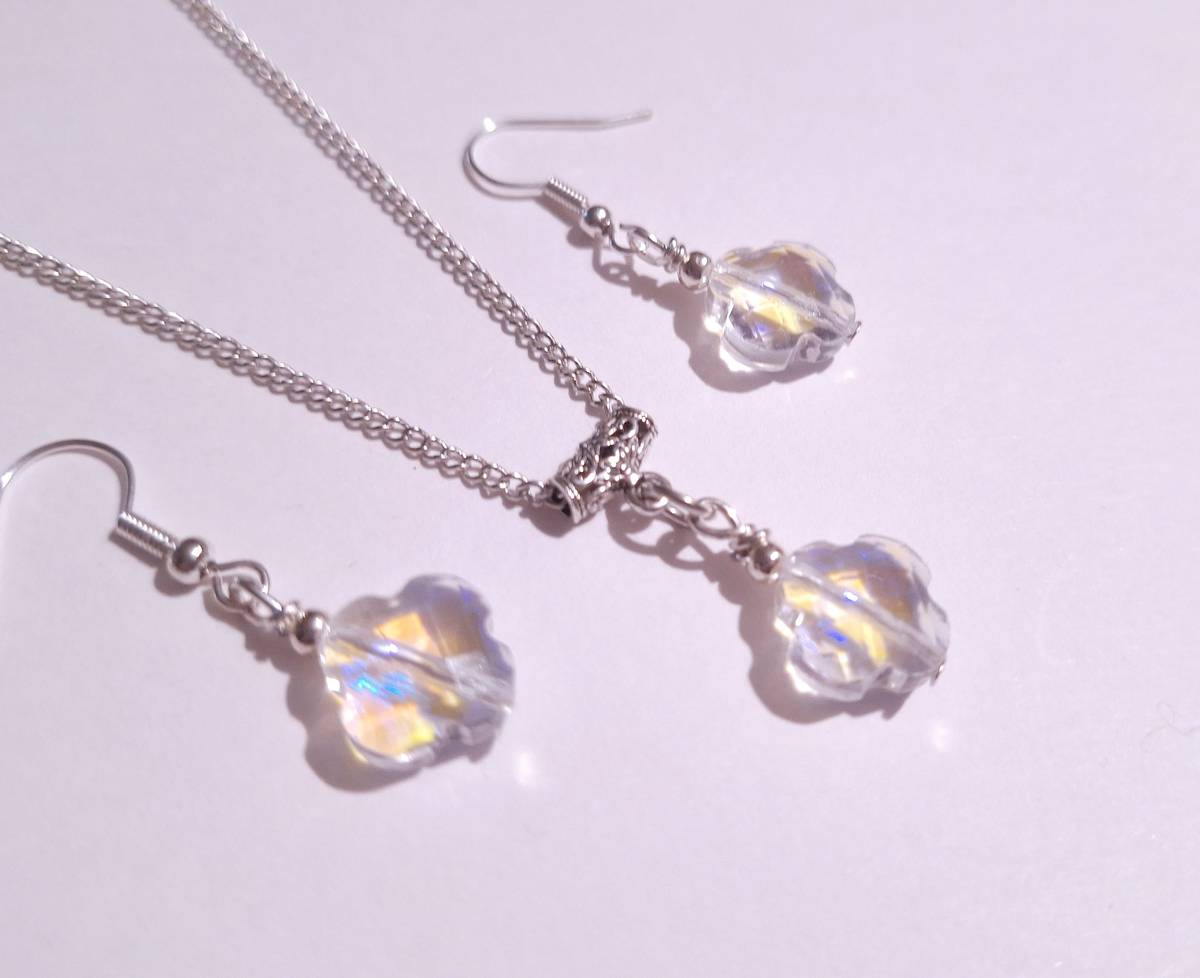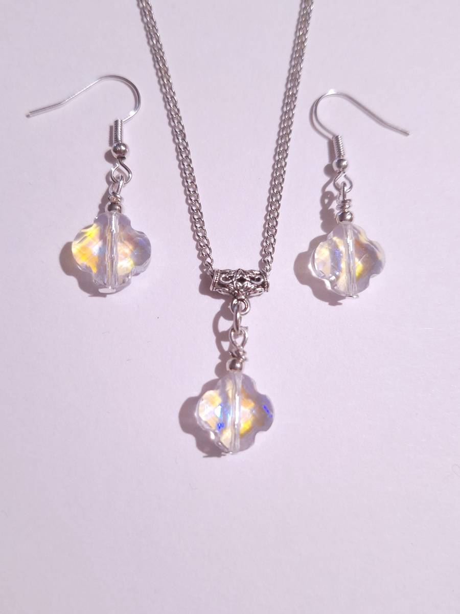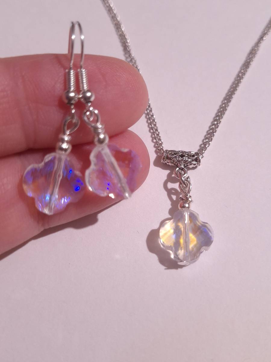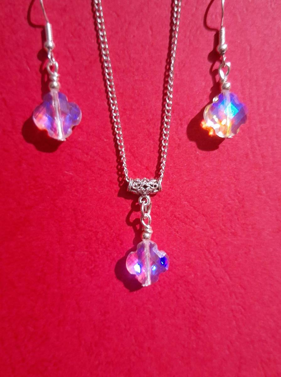 Beautiful Set of silver-tone Antique style and faceted cross Crystals necklace and earrings. Silver tone and Faceted Aurora Borealis crystal pendant Victorian style necklace and earrings. Boho necklace set. Bohemian necklace and earrings jewelry set. Romantic necklace and earrings. Beautiful necklace with same style earrings with faceted Crystals. Gift jewelry set.