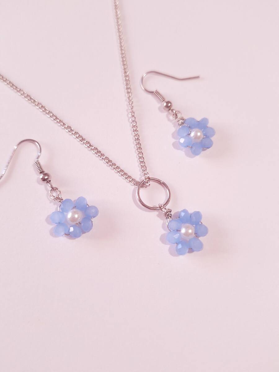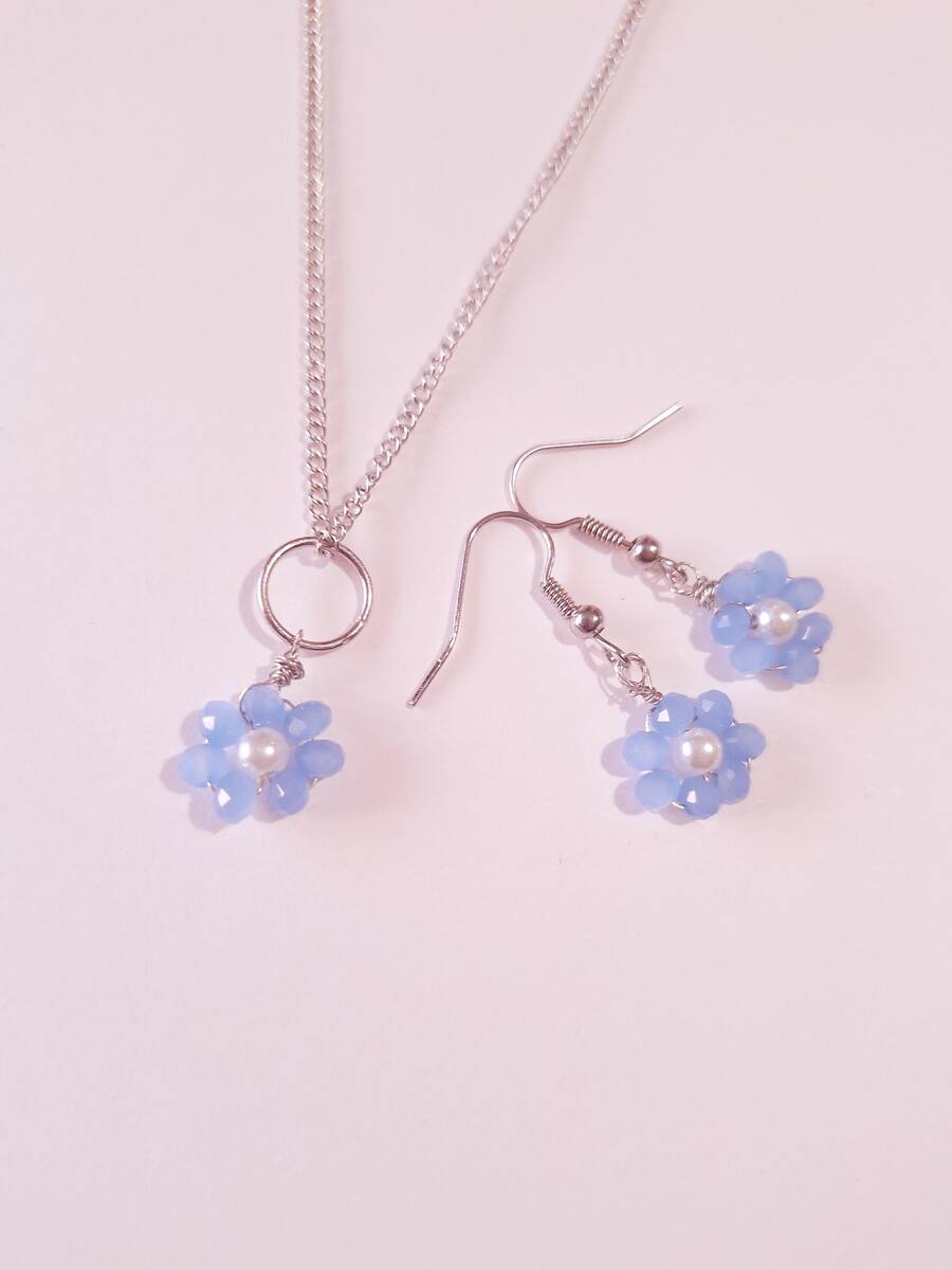 blue flower crystal and pearl silver jewelry set bohemian jewelry set earrings necklace Boho set blue crystals forget me not flower set bridal jewelry set gift set