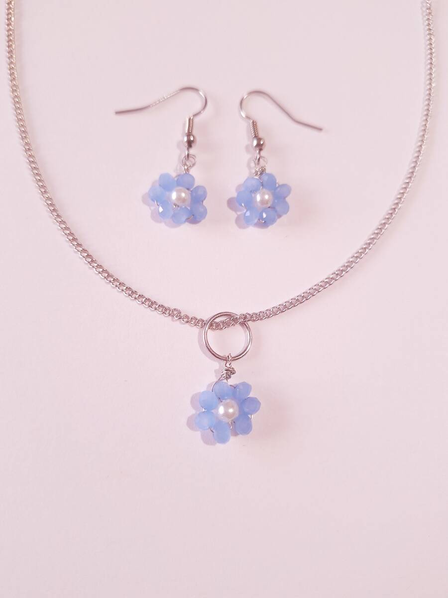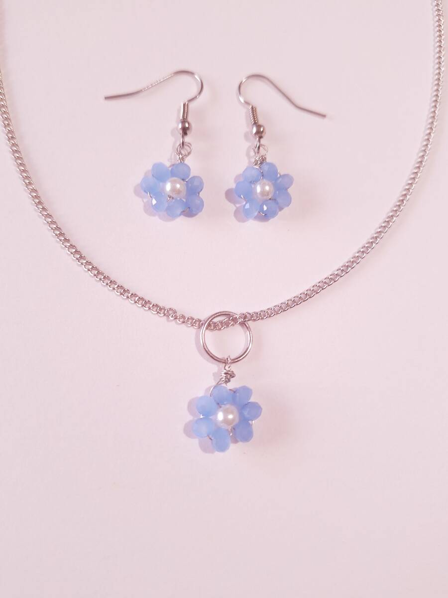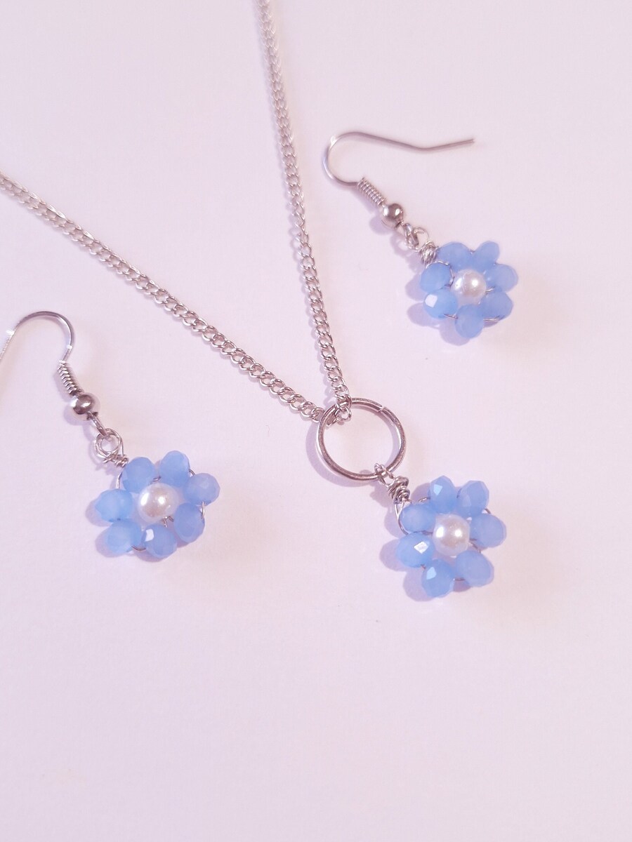 Blue flower silver jewelry set boho forget me not jewelry set earrings necklace
