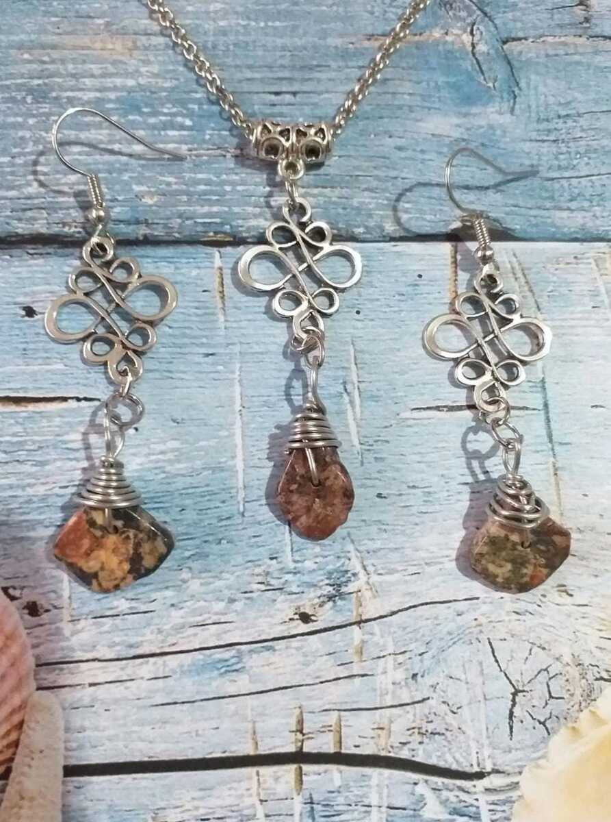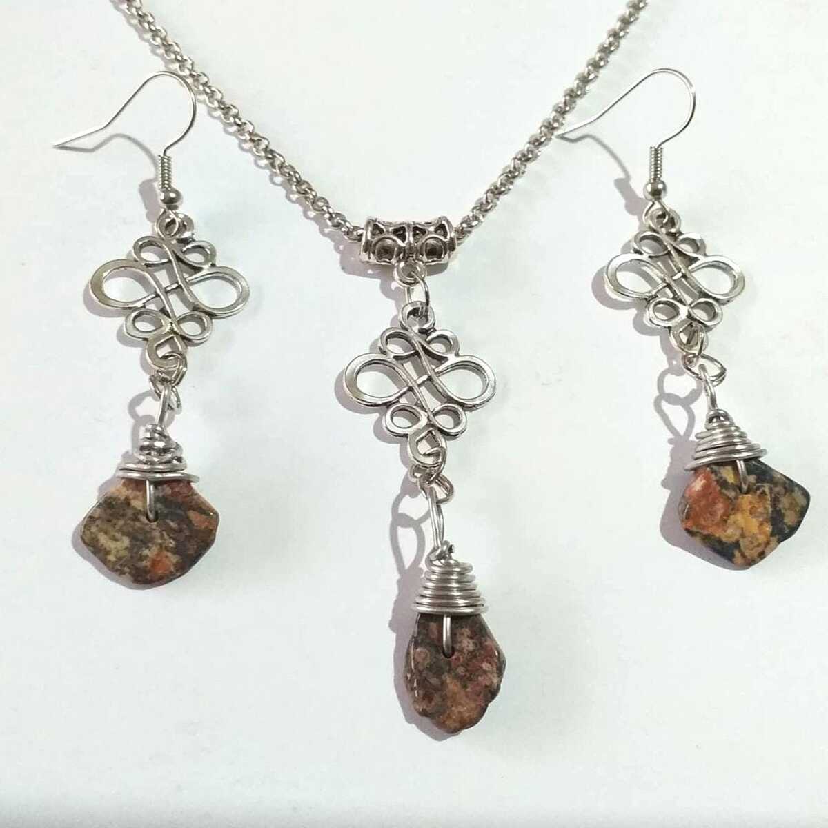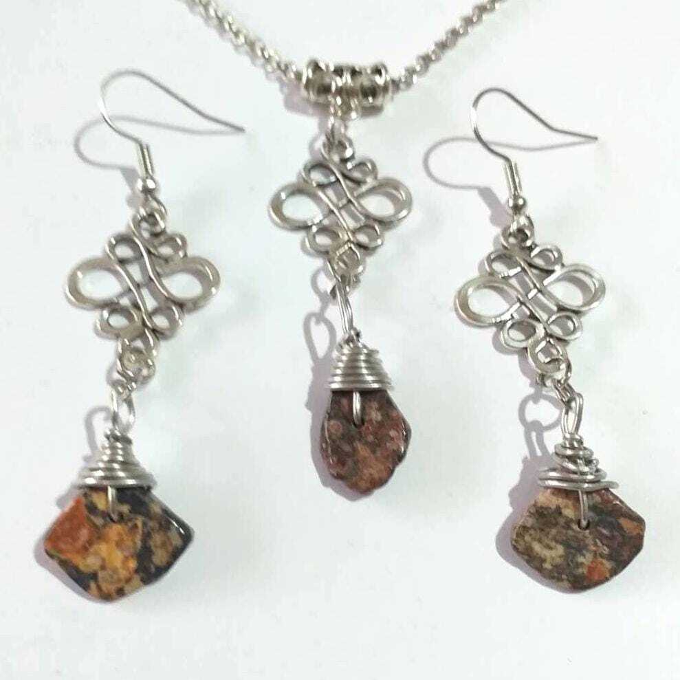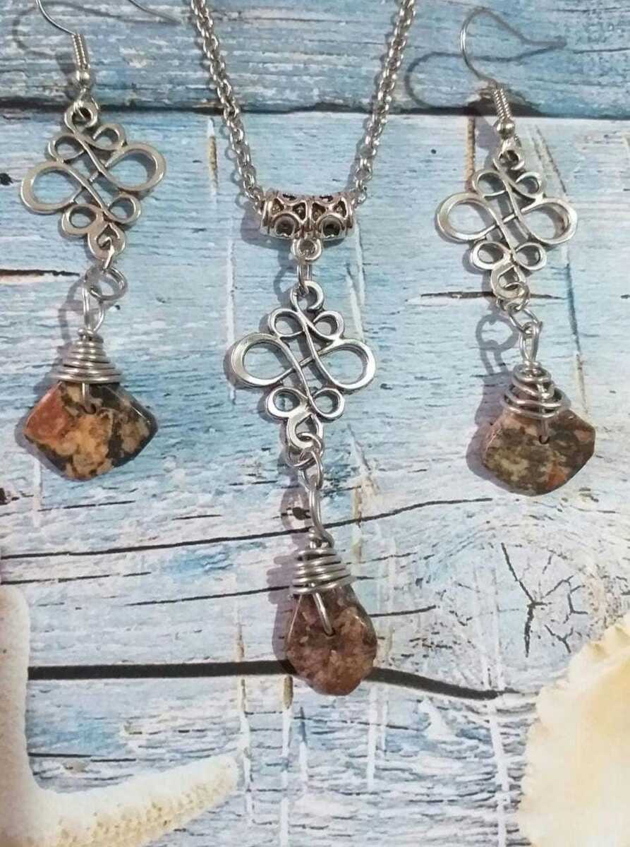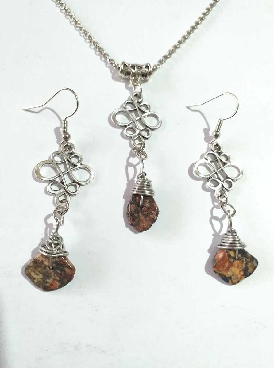 Beautiful silver-tone fine filigree ornaments Antique style Leopard Jasper natural shape set necklace and earrings . Silver-tone wire set earrings and necklace . Victorian style earrings and necklace . Boho earrings and necklace. Romantic jewelry set earrings and necklace. Beautiful earrings and necklace with natural shape Leopard Jasper .