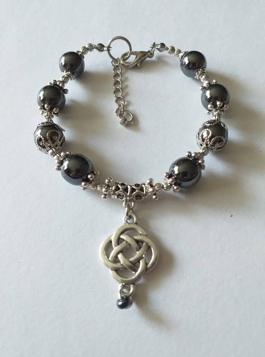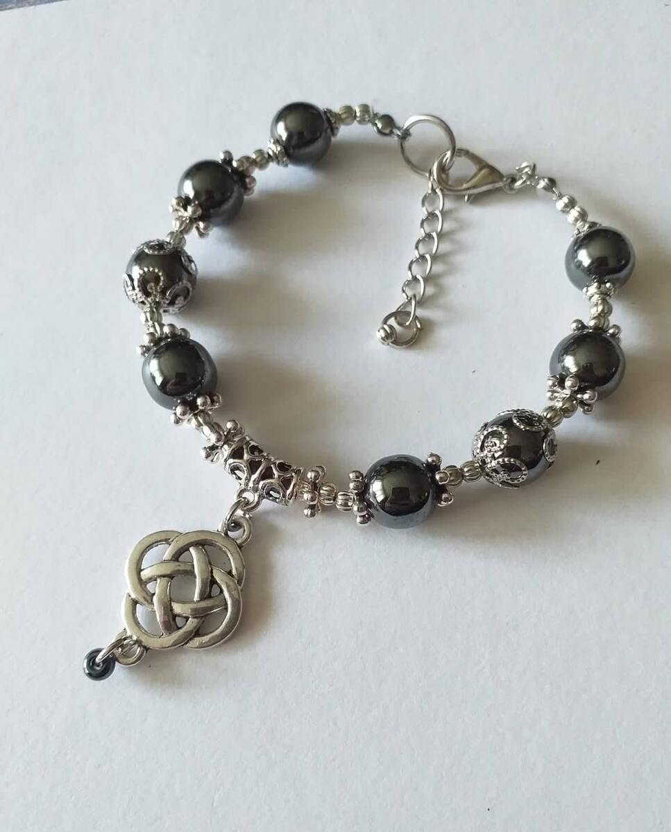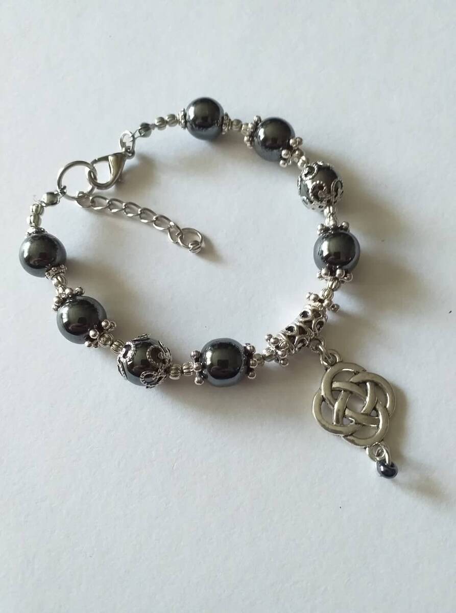 This bracelet is made with beautiful gemstones Hematite and silver-tone pendant charm of Celtic Love knot and filigree ornaments.