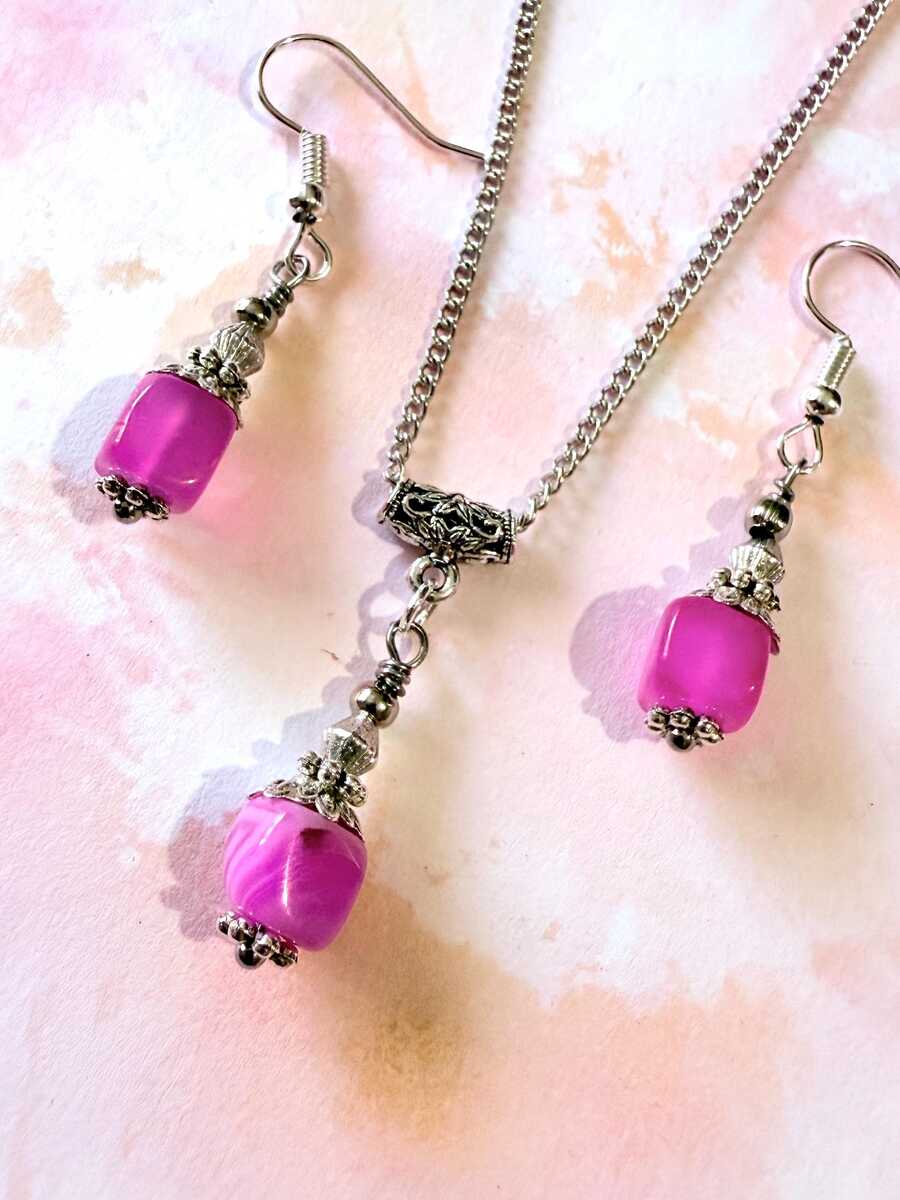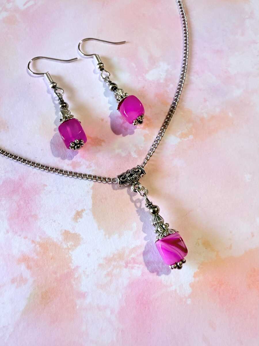 pink Agate Silver jewelry set Victorian pink Agate earrings agate necklace minimalist Boho Agate jewelry pink earrings magenta fuchsia set