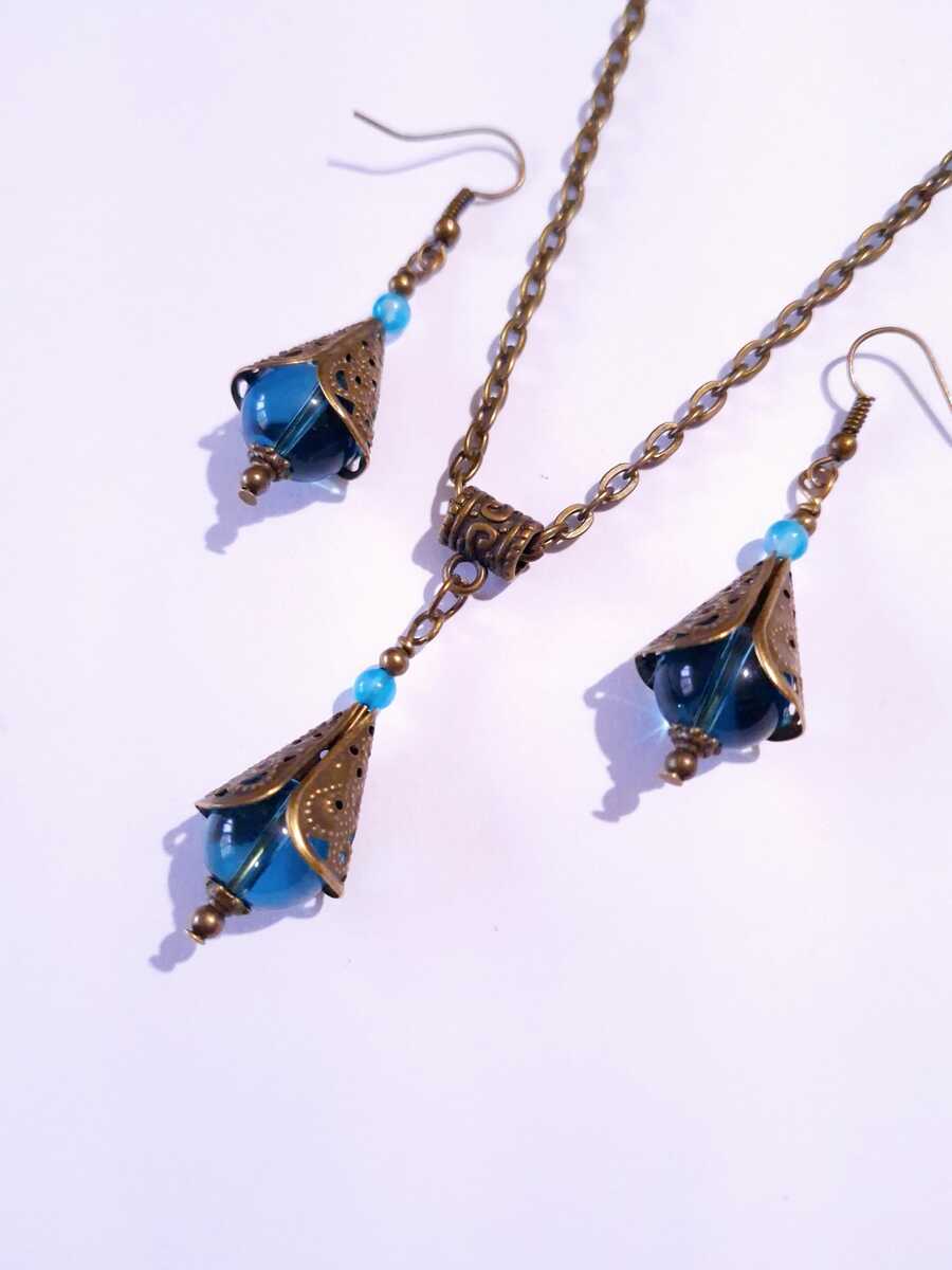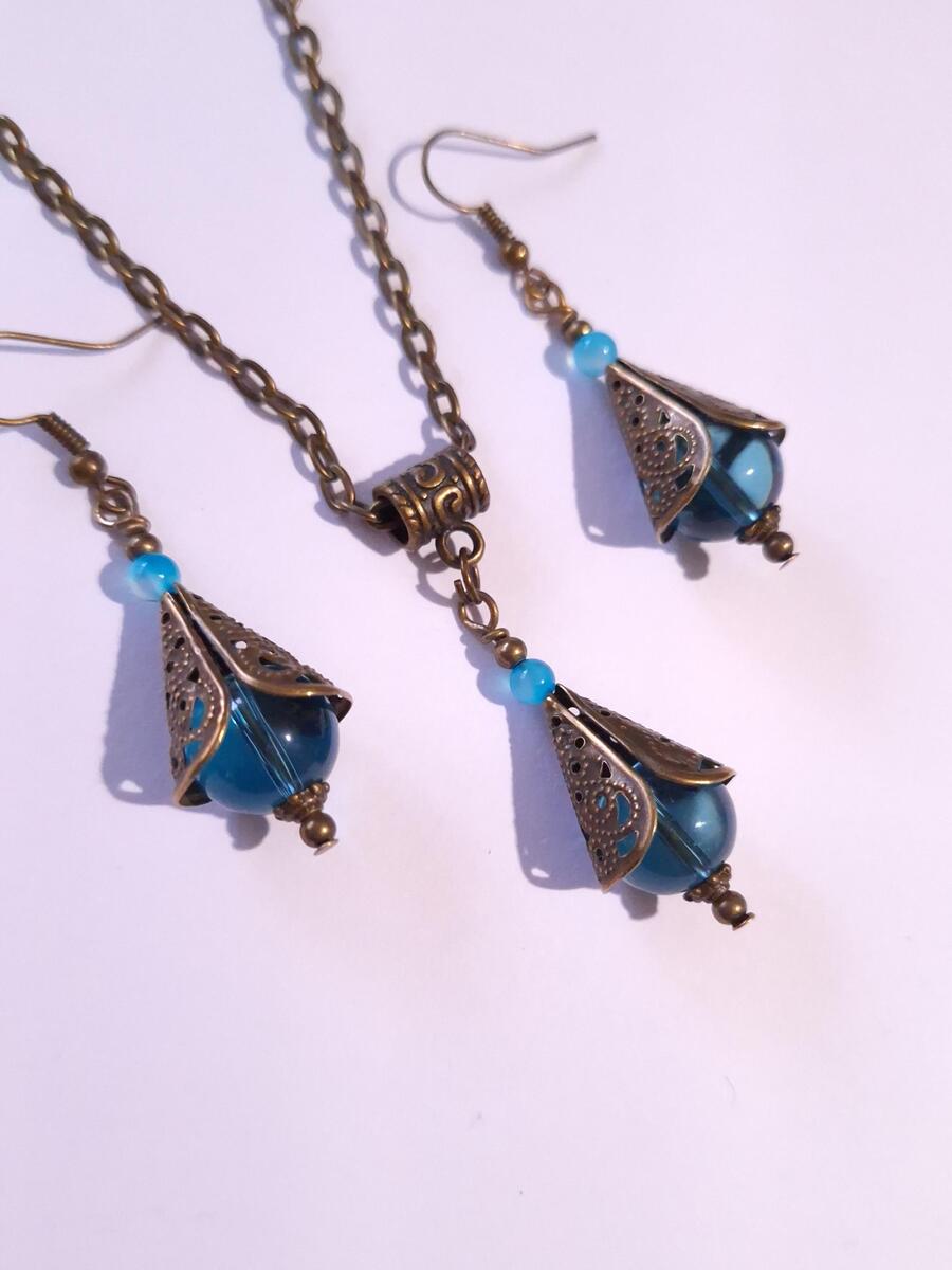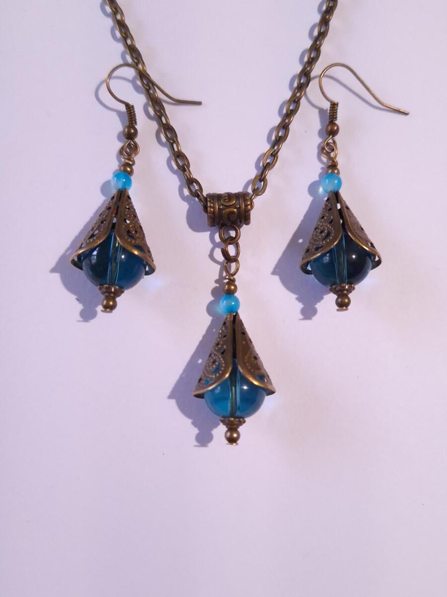 Beautiful Set of bronze-tone Antique style beautiful filigree ornaments and blue glass beads and little blue Agate necklace and earrings . Bronze filigree pendant Victorian style necklace and earrings . Boho necklace . Bohemian necklace and earrings . Romantic necklace and earrings . Beautiful necklace with same style earrings with beautiful bronze ornaments, light blue glass beads and little blue Agate.