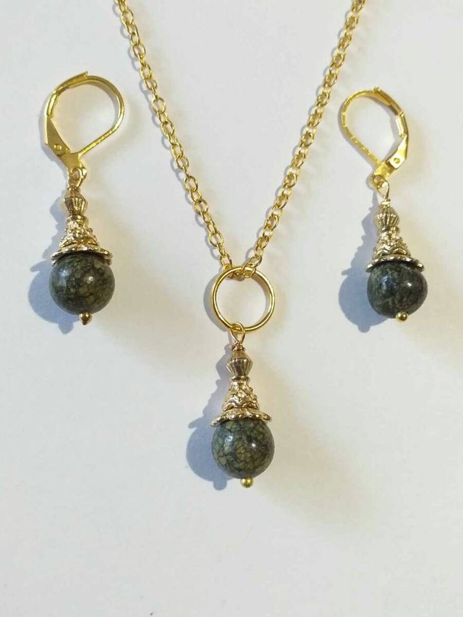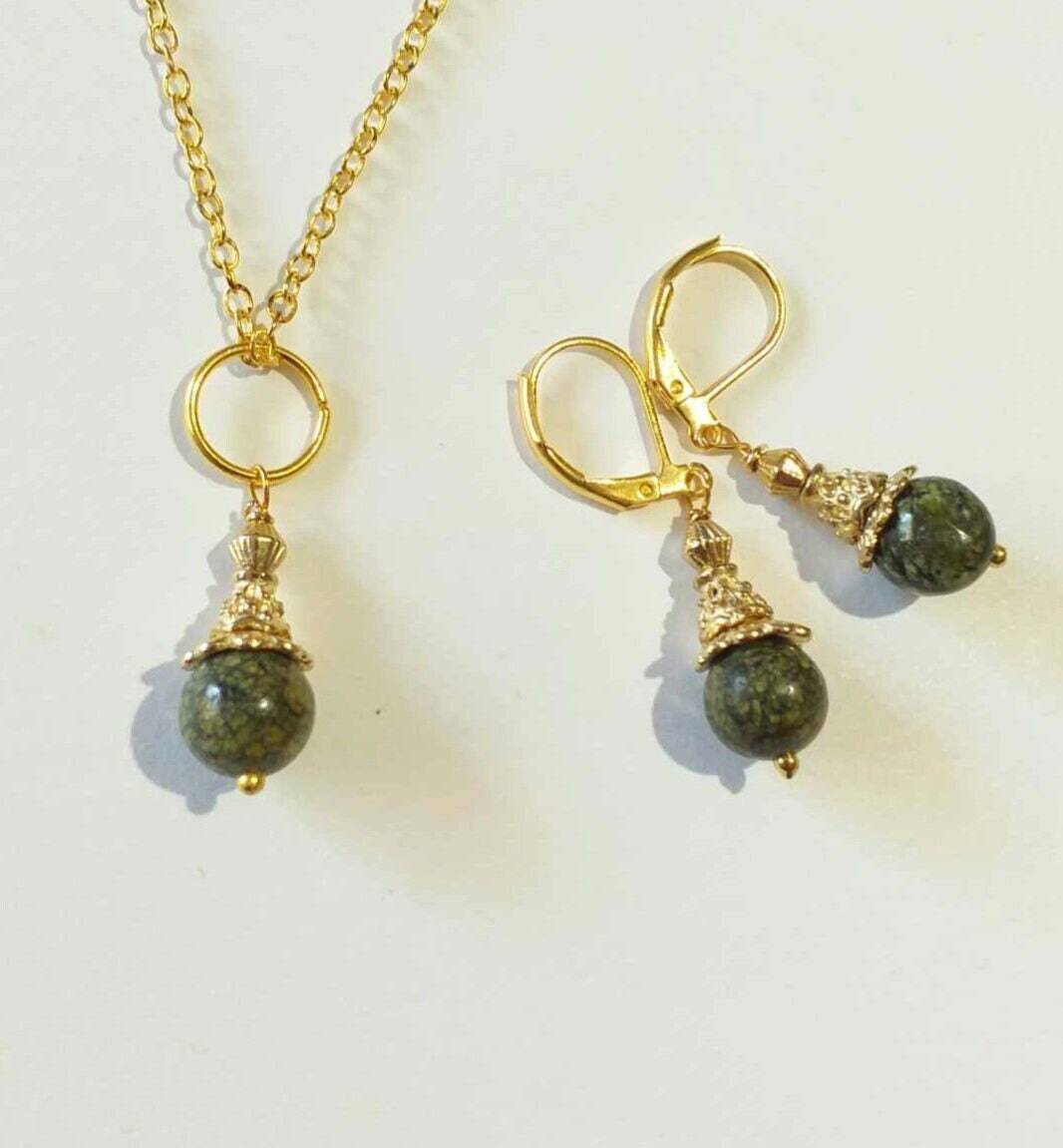 Beautiful Serpentine and gold ornaments jewelry set . Victorian Serpentine jewelry set earrings and necklace . Gold-tone beautiful Boho set teardrop earrings and necklace . Bohemian earrings . Bohemian necklace. Victorian style gold-tone green Serpentine gemstones dangle earrings and necklace with a beautiful ornamented gold-tone caps and beads . Romantic jewelry set Serpentine earrings and Serpentine necklace .