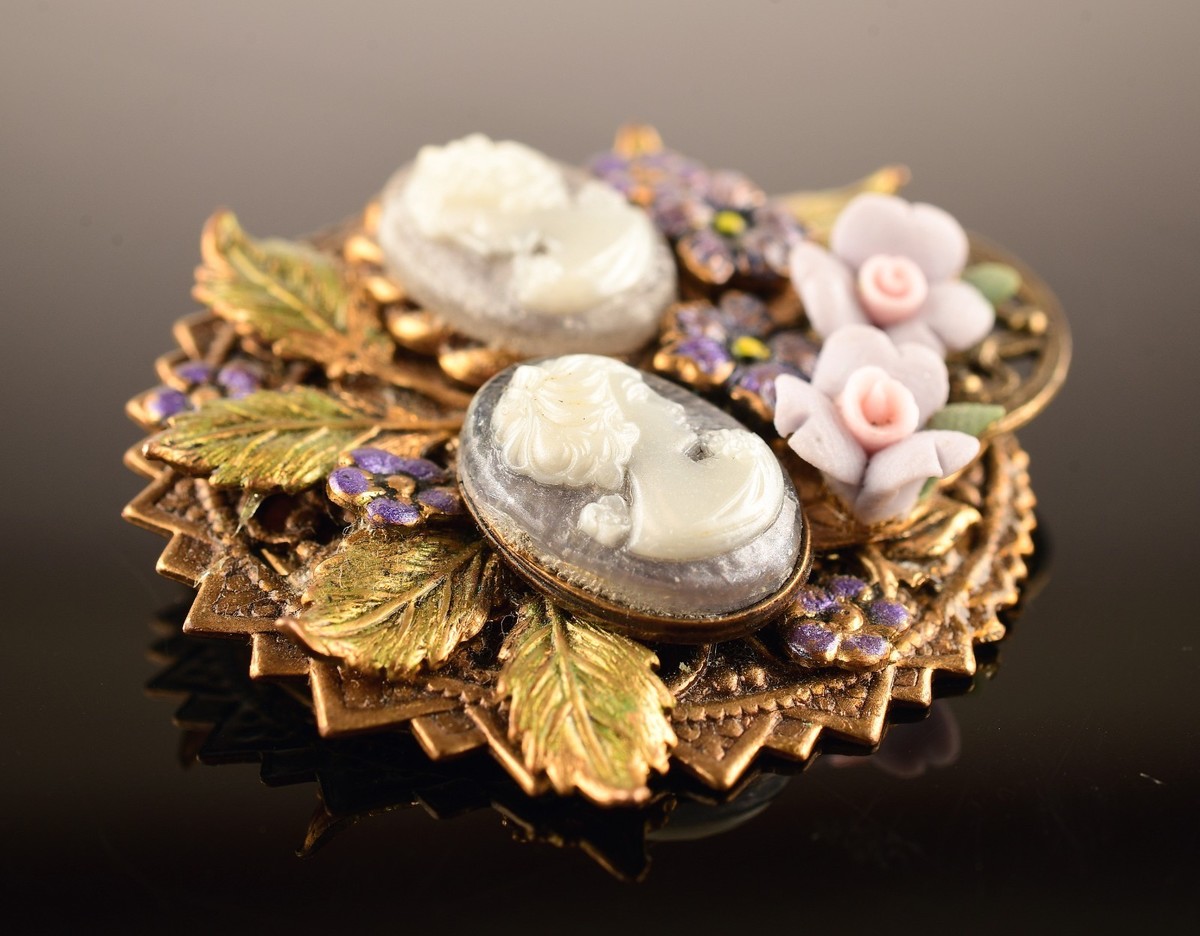 BEAUTIFUL MONTAGE DESIGNS 1998 PIN BROOCH WITH CAMEOS AND FLOWERS