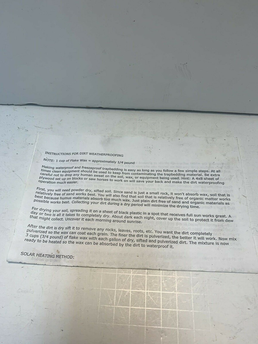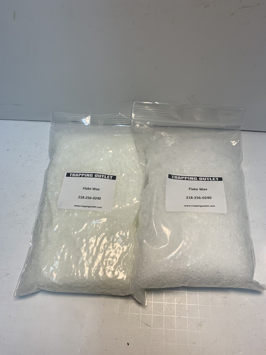 Up for sale are two (2) bags of 1 lb flake wax. No more frozen in traps. No more rebedding after a rain, snow, or ice melt. Traps bedded in treated dirt will function in any weather conditions. Dirt treated with this wax won?t rust your traps, will be waterproof and freeze-proof, as well as free from foreign odors. Depending on your soil, it will take from 1/4 lb. to lb. of flake wax to treat one gallon of dirt. Black dirt will require more wax than sand. Directions for various production methods are included.