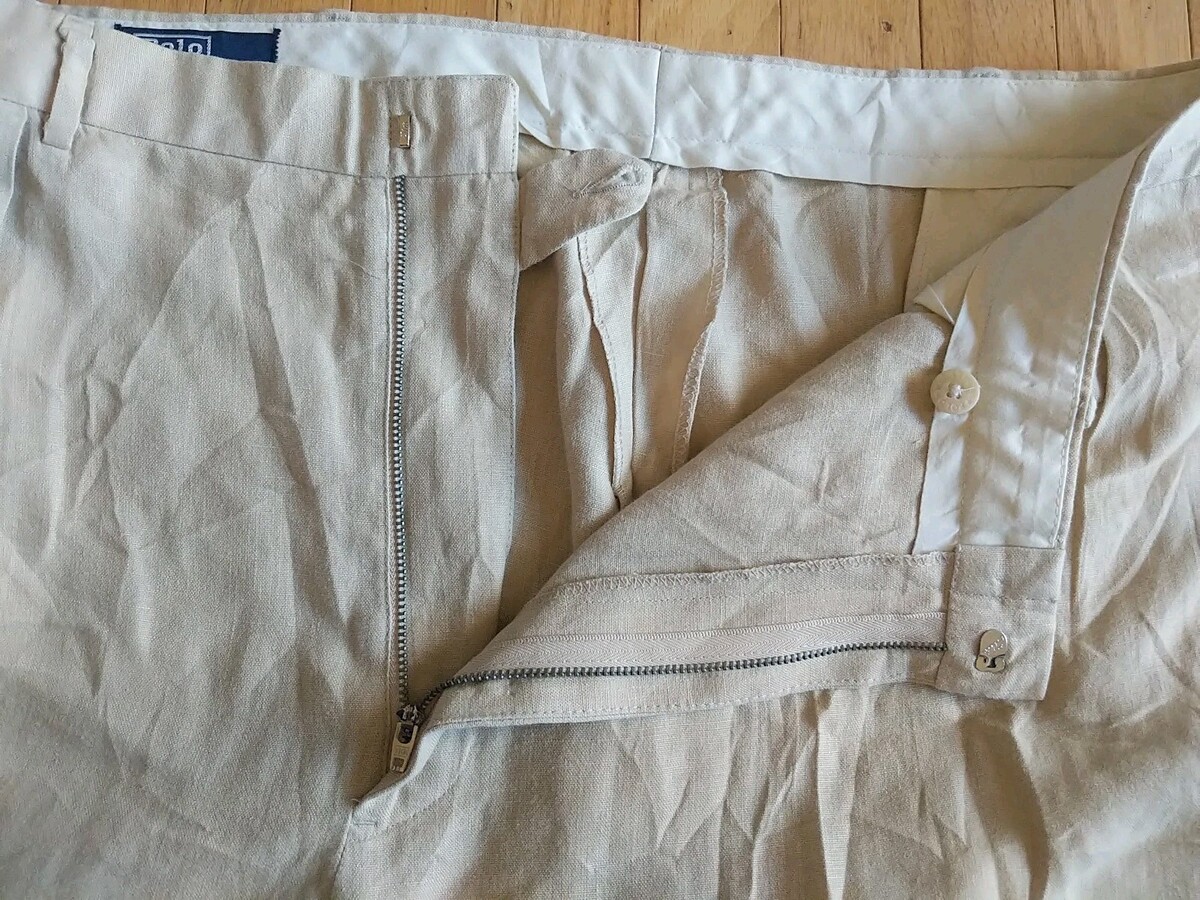 Polo Ralph Lauren Pants Mens 42x32 Beige 100% Linen Pleated Cuffed Vintage