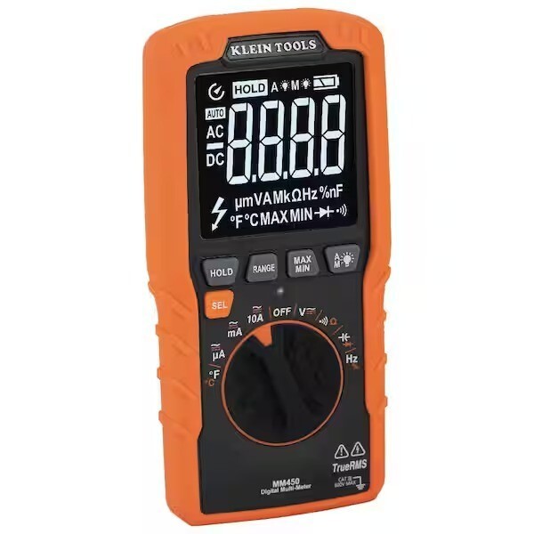 Klein Tools MM450 Multimeter is a TRMS auto-ranging slim multimeter that measures AC/DC voltage, AC/DC current, and resistance. It can also measure temperature, capacitance, frequency, duty-cycle, and test diodes and continuity. It features a high visibility, reverse contrast display with an optical sensor to automatically optimize viewing in dark or bright ambient light. The slim profile of the MM450 makes this meter almost the size of a cell phone and it conveniently fits into most pockets. The MM450 features the same quality leads you have come to expect from the Digital Multimeter line at Klein Tools. Years of field research, combined with extensive input from electricians across America, inspired the development of meters and electrical testers loaded with innovative, time-saving features.