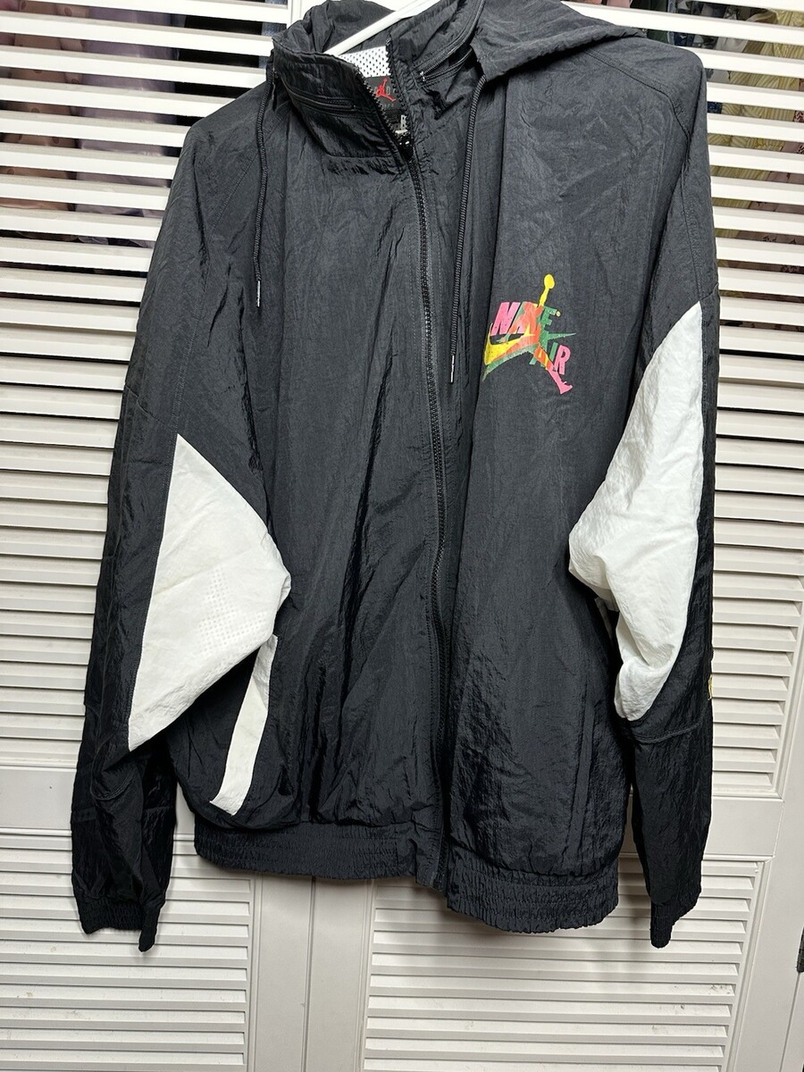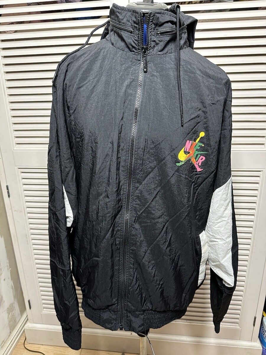 The product is a Nike Air Jordan Jumpman windbreaker jacket in size XL. It features a black nylon outer shell with a multicolor design, embodying a 90s theme. This unisex jacket is perfect for adults looking for a stylish and comfortable outerwear option with a hint of nostalgia.