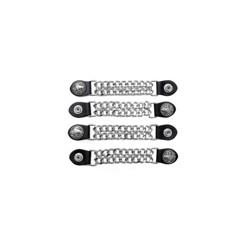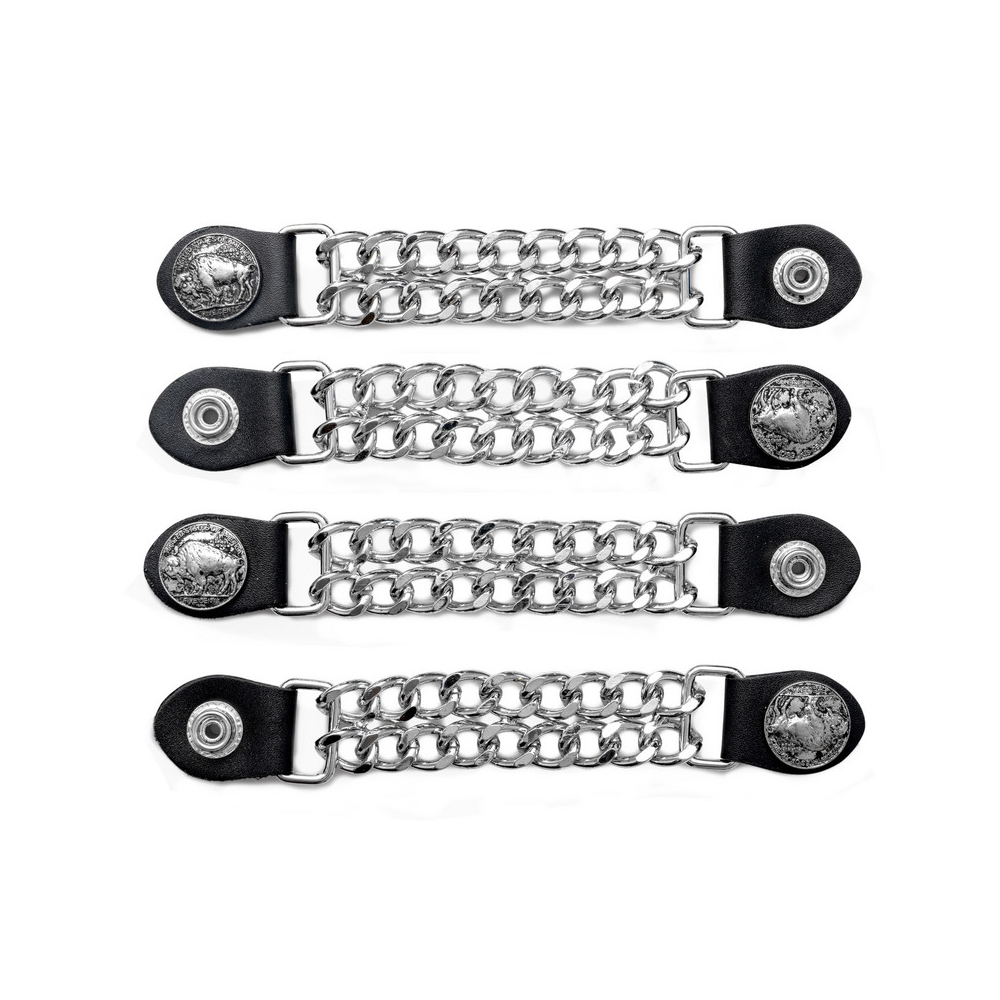 Inject an element of comfort and style into your road gear. These vest extenders showcase unique designs while you get a bit more breathing room out of your garment. Includes: 4pc faux leather and chrome chain extender with Buffalo Head Nickel medallions. Measures 6-1/2 x 1 . Not sold individually.