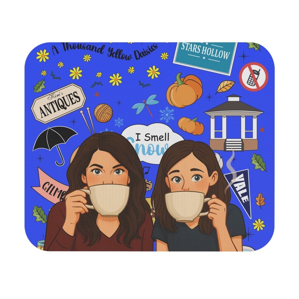 A cozy, illustrated rectangle mouse pad that brings a little hometown warmth to your desk. Soft, vibrant artwork shows two Gilmore Girls sharing steaming mugs amid tiny icons with the Stars Hollow feel... a guitar, dog, camper van, donuts and pennants ? creating a calm, nostalgic scene while you work. The smooth printed surface lets your mouse glide silently, and the thin, dense foam provides steady support without adding bulk. It grips the desktop with a rubber backing so your mouse movements stay precise, while the durable print keeps colors bright through everyday use. This small desk accessory turns routine clicks into a moment of comfort and familiar charm.
