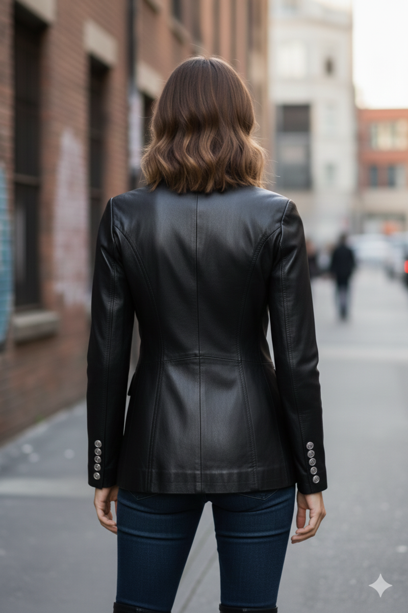 Blazer negro de piel de cordero de doble pecho para mujer de cuero formal...