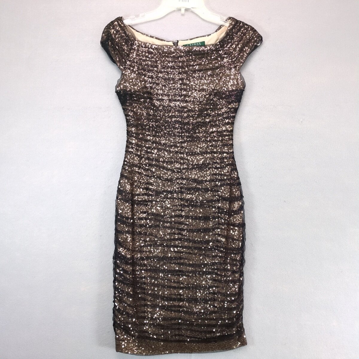 LRL Ralph Lauren Evening Gold Sequin Black Chiffon Bodycon Dress Sz 2P Cocktail