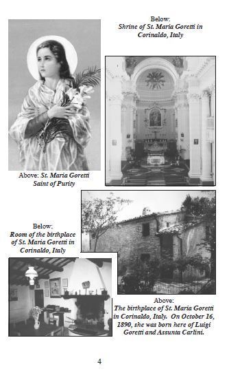 Discover Corinaldo, Italy, where St. Maria Goretti was born and lived her early years, and Nettuno, Italy, and the house where she died defending her virginity against her attacker. Discover artifacts of the life of the young Saint, including: her birthplace in Corinaldo, Italy the room in which she lived, her bed, her shrine in Corinaldo, photographs of her mother with her attacker who was at her Canonization, and was forgiven by her mother.